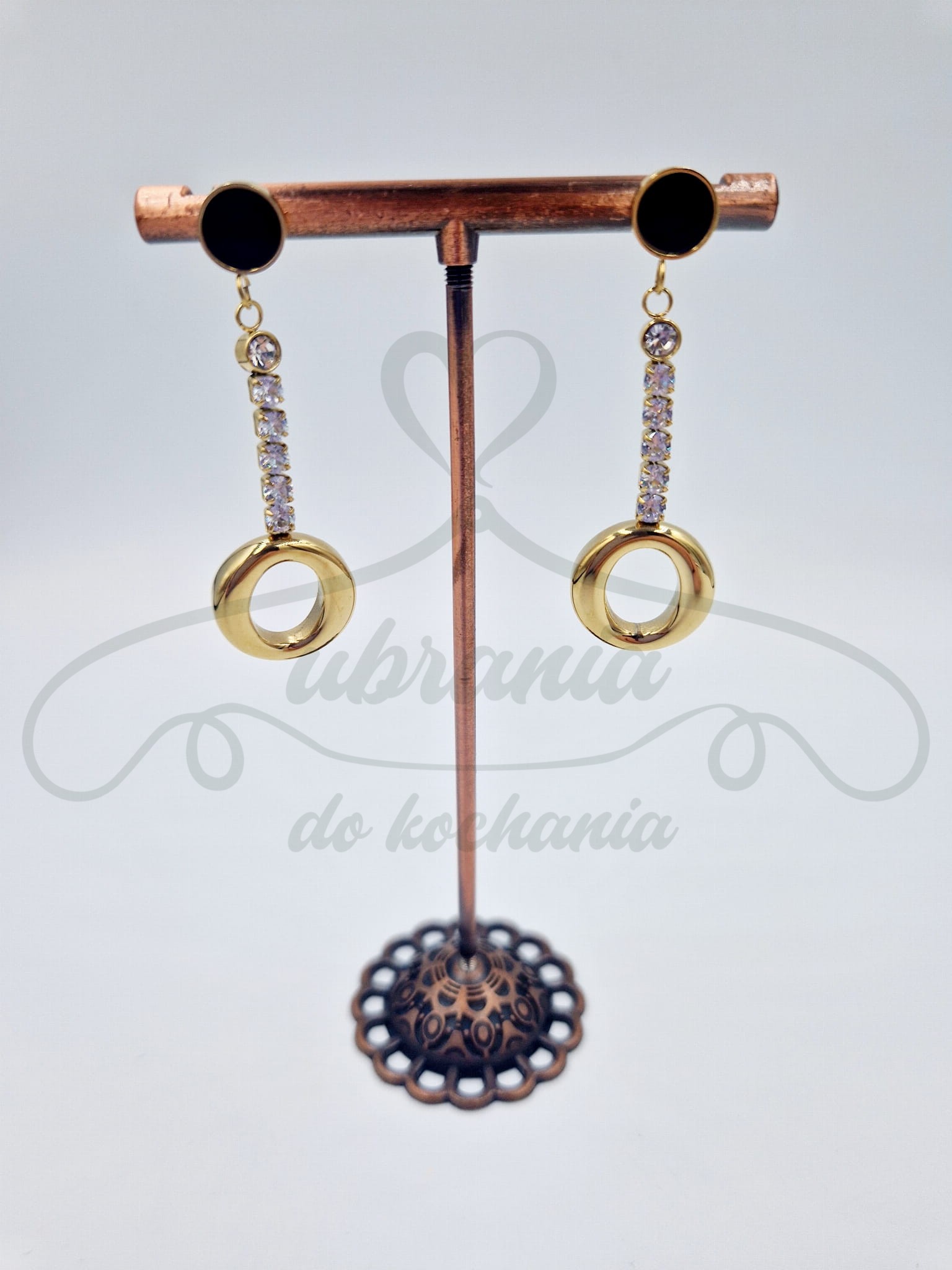 Kobiece kolczyki w kolorze złotym. Stworzone z najwyższą starannością, będące idealnym uzupełnieniem każdej Twojej kreacji na wyjątkowe okazje. W całości wykonane z wysokiej jakości stali szlachetnej. Kolczyki charakteryzują się niepowtarzalnym i zdobnym stylem. Docenią je panie, które lubią biżuterię dopracowaną w najmniejszym szczególe.