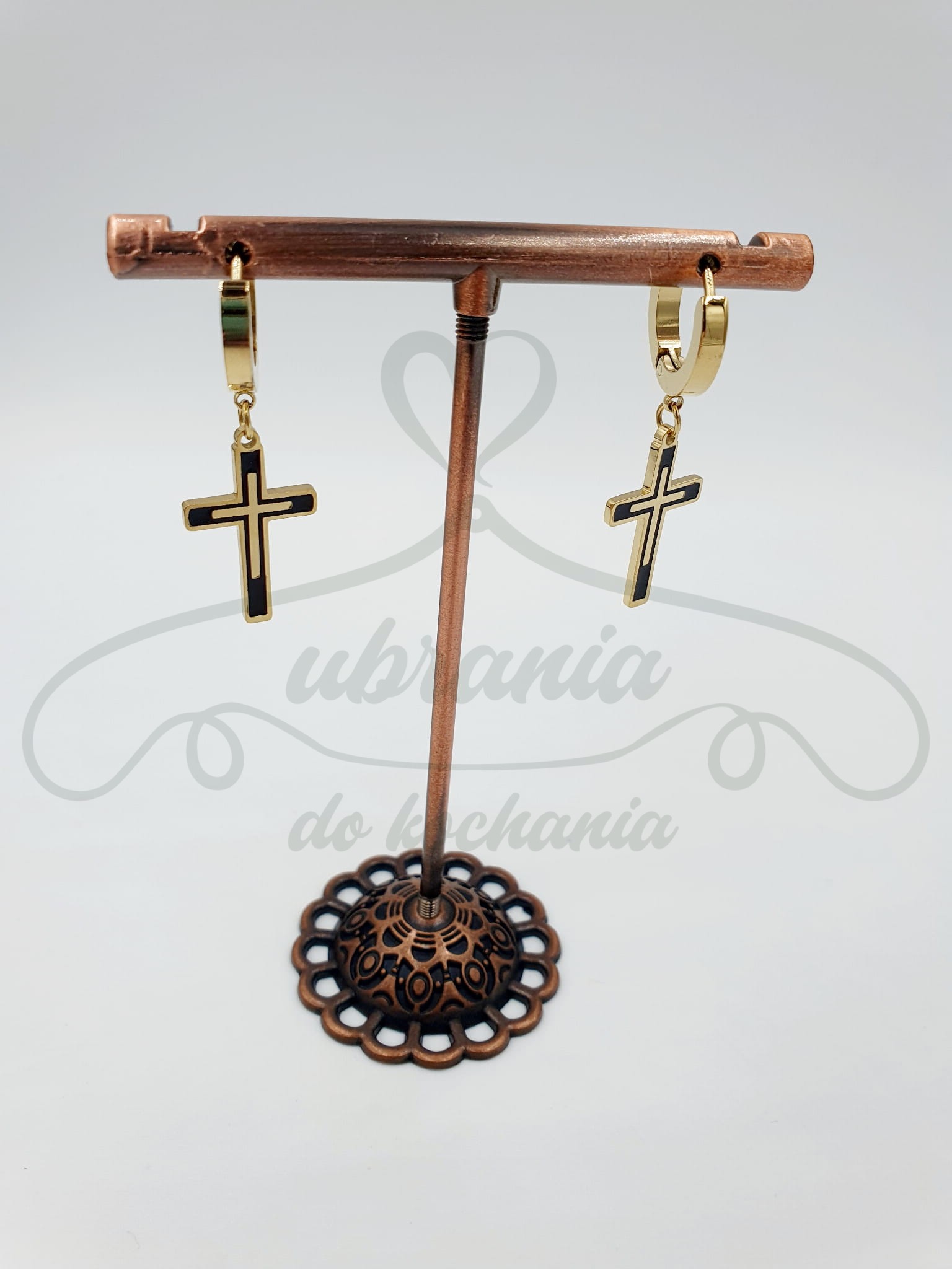 Złote kolczyki z czarnym krzyżykiem wykonane ze stali szlachetnej 316L.