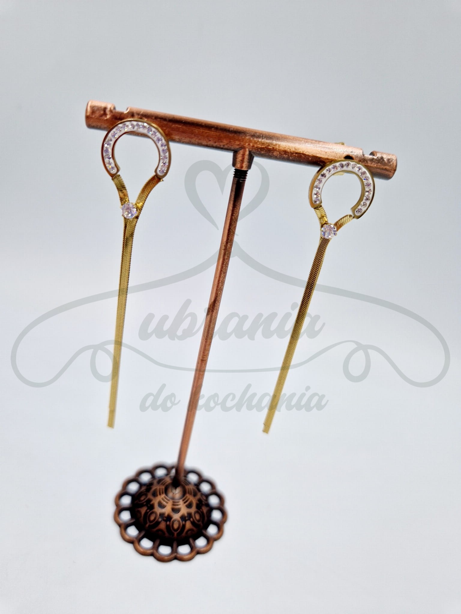 Wspaniałe kolczyki pasujące do eleganckich oraz codziennych stylizacji. Kolczyki są w kolorze złotym, zdobione cyrkoniami. W całości wykonane ze stali szlachetnej.