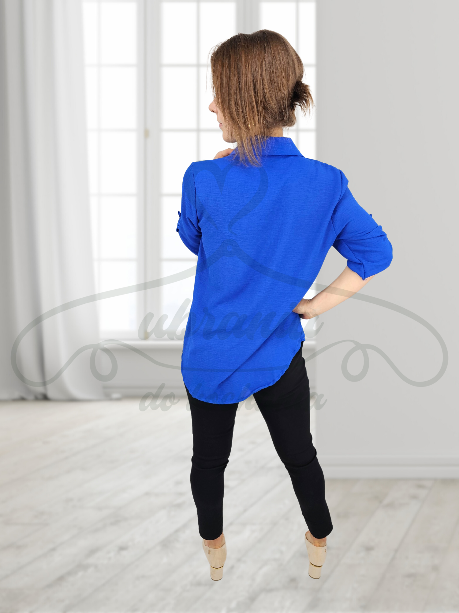 Nowoczesna koszula o luźnym kroju w kolorze chabrowym z cyrkoniową aplikacją na kieszonce. Model po całości zapinany na guziki z kołnierzykiem. Rękaw z możliwością podpięcia na guzik. Rozmiar uniwersalny pasujący do każdej sylwetki. Wykorzystasz ją w wielu codziennych i eleganckich stylizacjach!