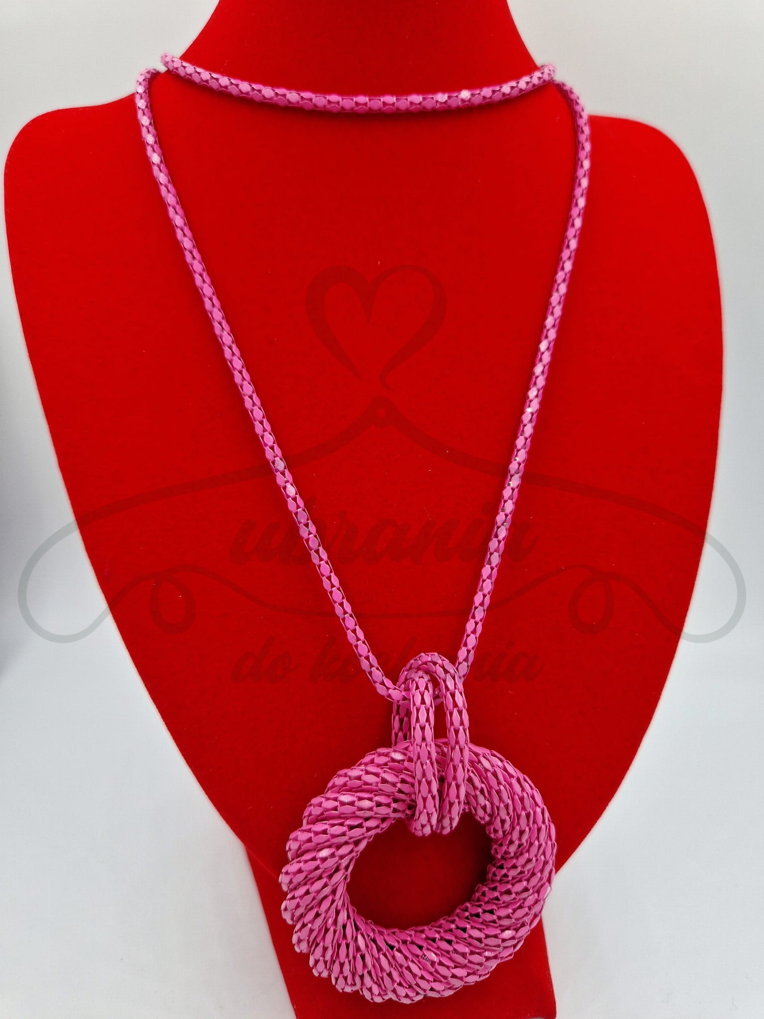 Naszyjnik długi, damski w kolorze różowym z dużą zawieszką. Biżuteria sztuczna. Świetny dodatek do bluzek, sukienek i sweterków