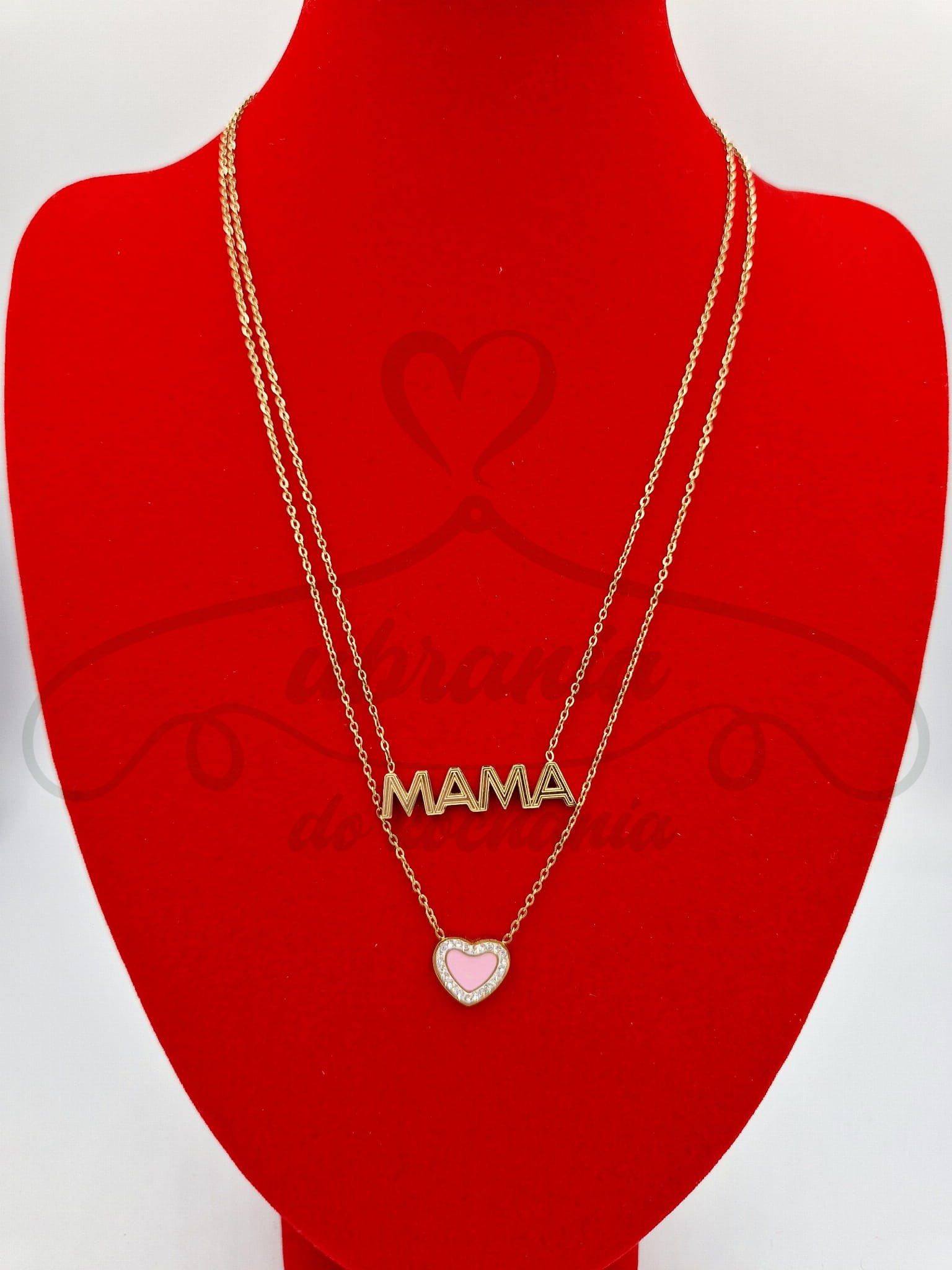 Naszyjnik w kolorze złotym, podwójny z napisem "MAMA" oraz różowym serduszkiem z cyrkoniami. Bardzo uroczy oraz delikatny model, wykonany jest ze stali szlachetnej 316 L. Idealny prezent dla mamy!