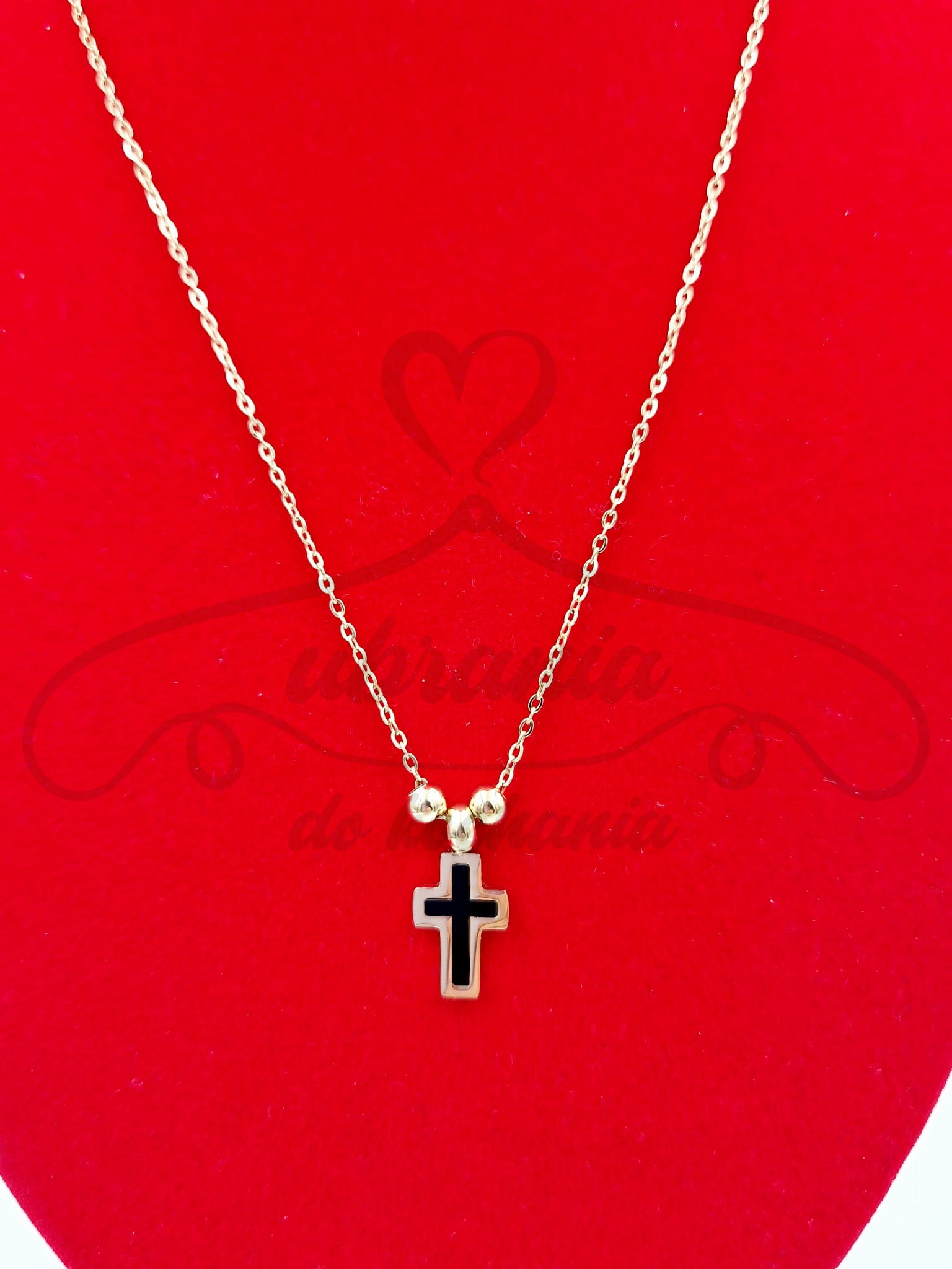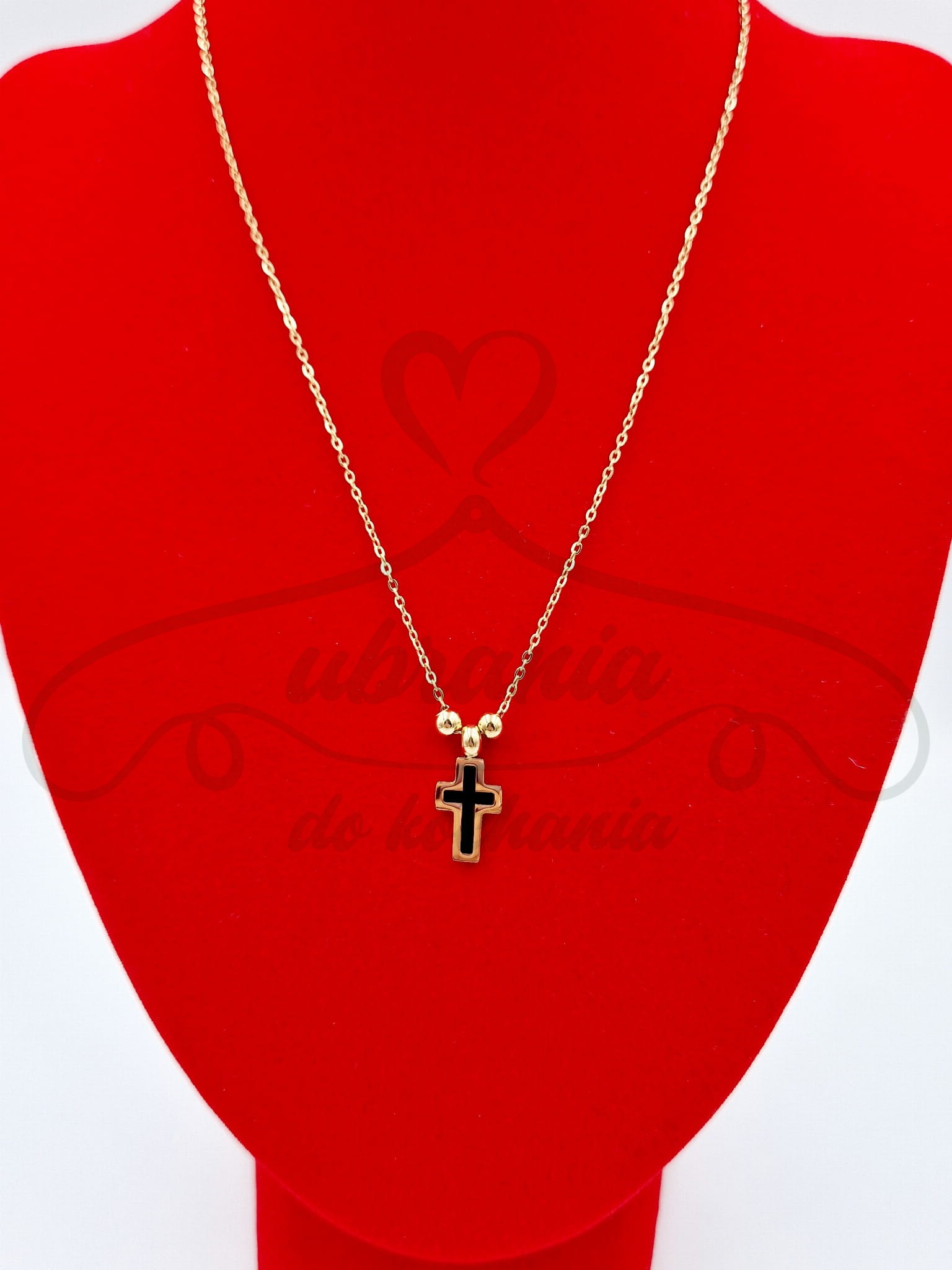 Naszyjnik w kolorze złotym z czarnym, małym krzyżem. Bardzo efektowny oraz delikatny model pasujący do każdej stylizacji. Wykonany z wysokiej jakości stali szlachetnej.