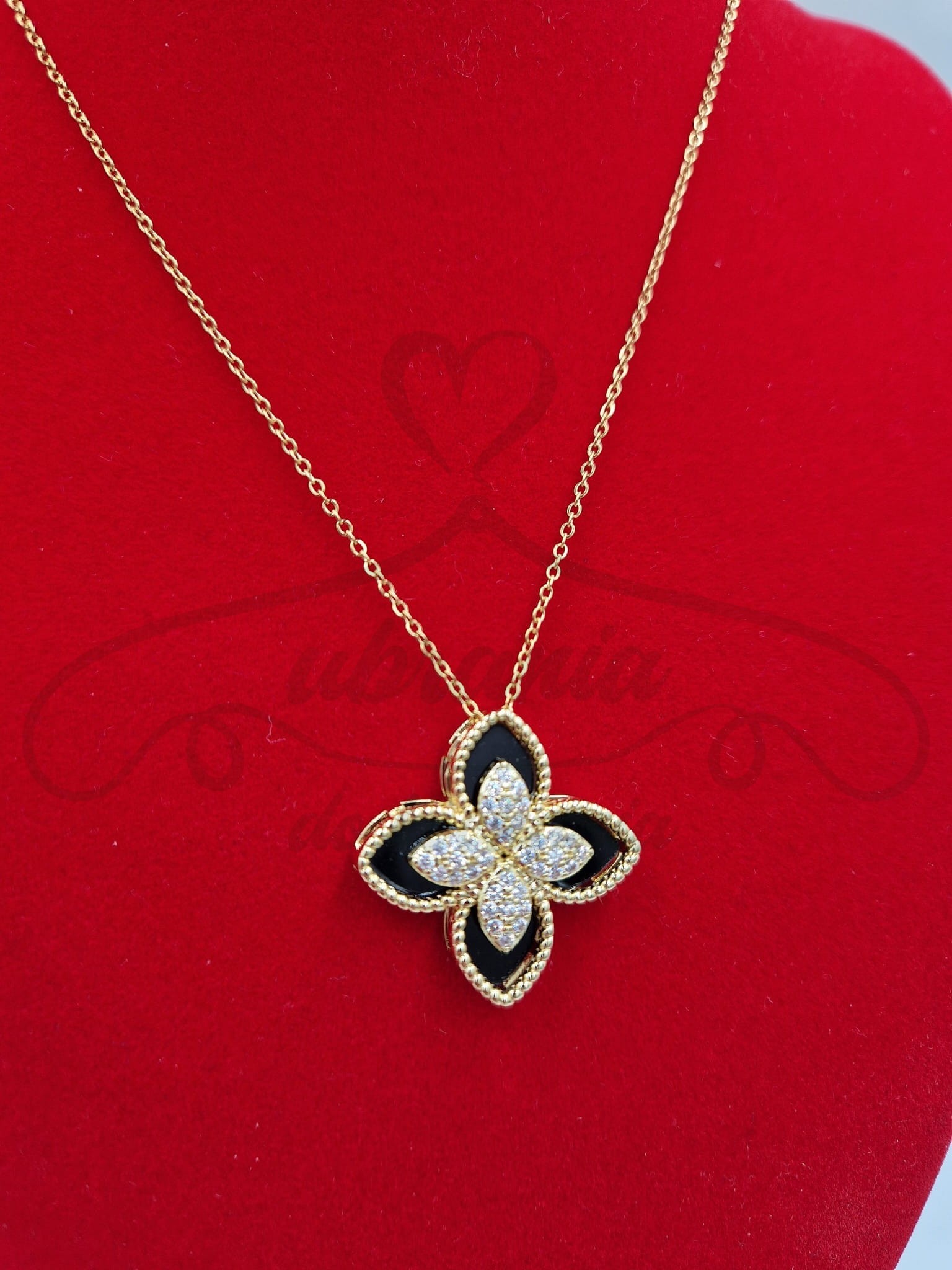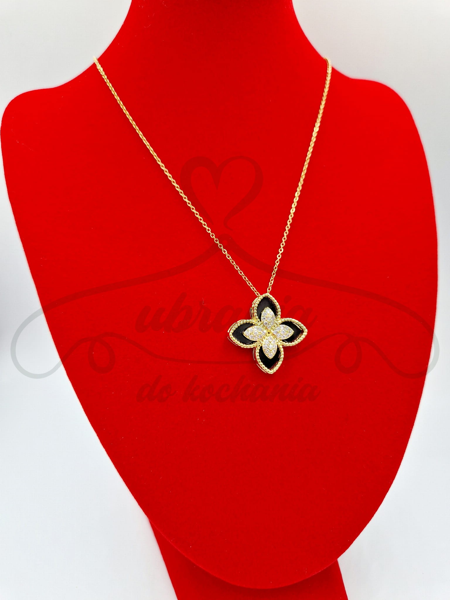 Elegancki naszyjnik wykonany ze stali szlachetnej z zawieszką w kształcie czterolistnego kwiatka. Połączenie złotych konturów, czarnego wypełnienia i lśniących cyrkonii nadaje mu luksusowego charakteru. Idealny wybór dla kobiet ceniących subtelną biżuterię z nutą glamour.