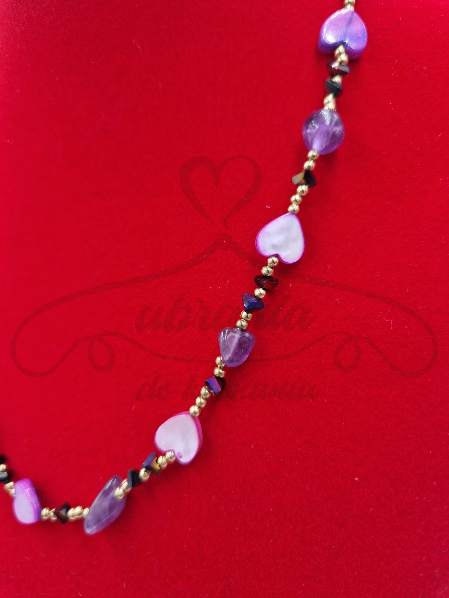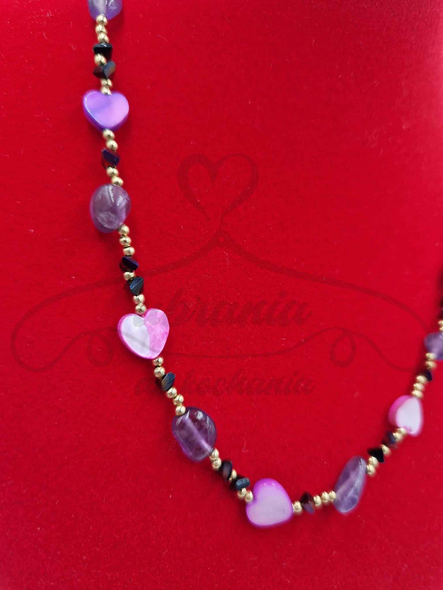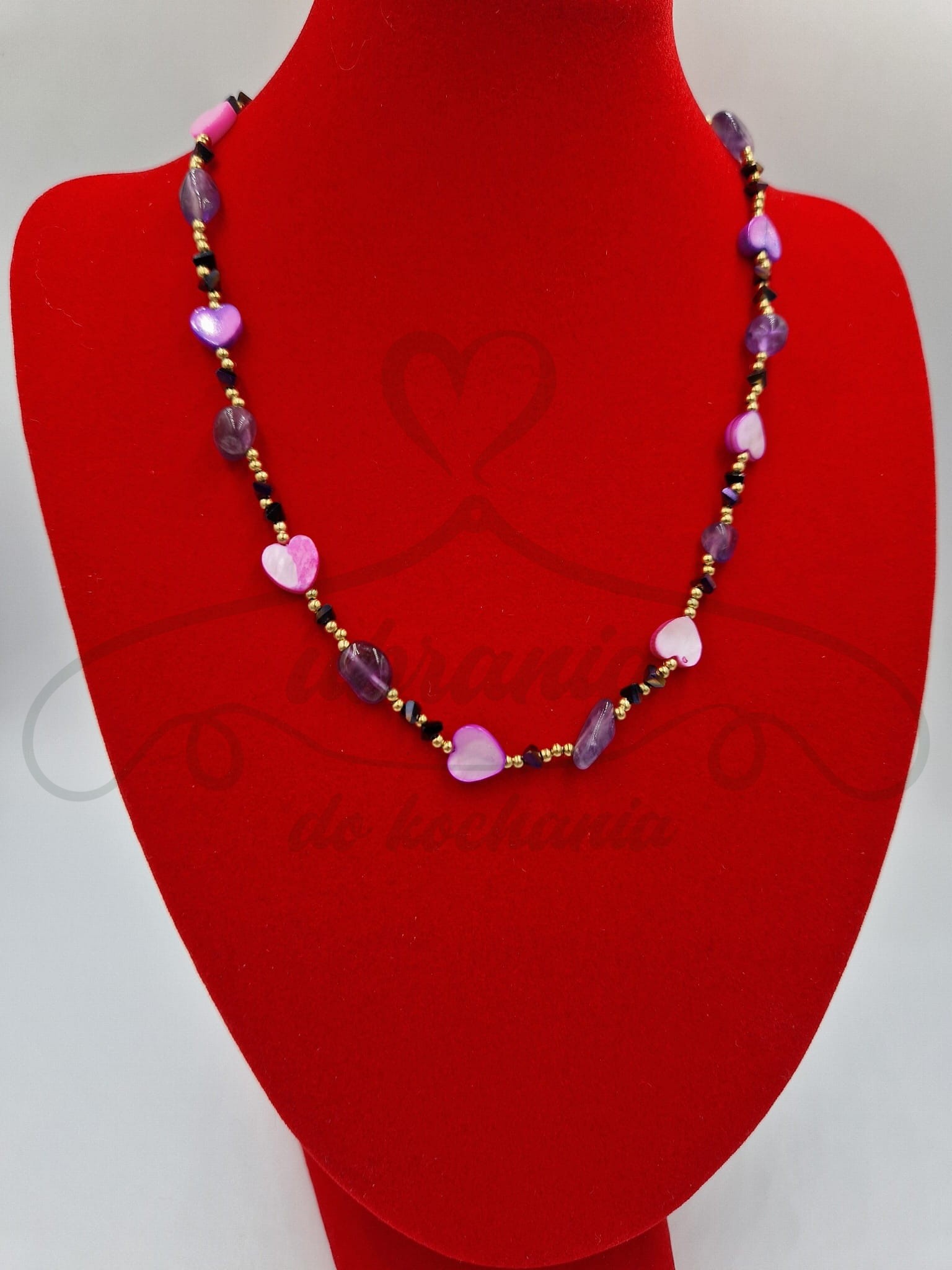 Kolorowy i energetyczny naszyjnik łączący serduszka z masy perłowej w odcieniach różu z naturalnymi kamieniami ametystu. Całość dopełniają drobne koraliki, które nadają kompozycji głębi i kontrastu. To biżuteria pełna wdzięku i kobiecej energii – idealna dla miłośniczek oryginalnych dodatków z nutą romantyzmu.