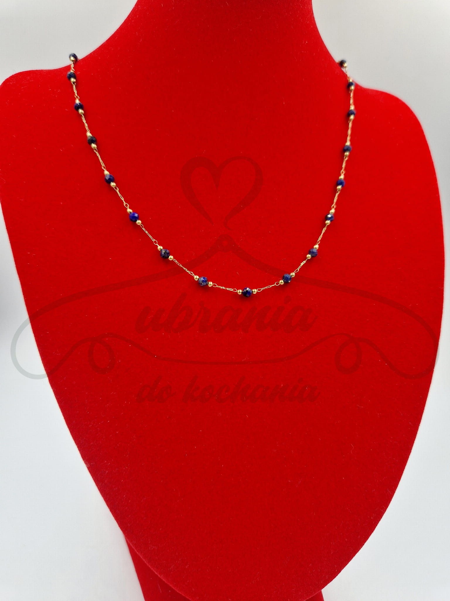 Subtelny naszyjnik na złotym łańcuszku, ozdobiony drobnymi granatowymi koralikami. Elegancki, lekki i bardzo kobiecy – świetnie podkreśla dekolt i dodaje szyku zarówno codziennym, jak i wieczorowym stylizacjom. Idealny wybór dla osób ceniących delikatną, ale efektowną biżuterię.