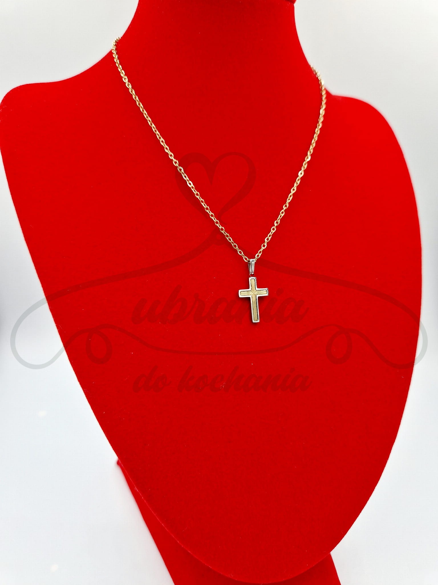 Wyjątkowo urokliwy naszyjnik w kolorze złotym. Krzyż w obramowaniu srebrny ze złotym, frezowanym wypełnieniem. Skromny oraz błyszczący model wykonany ze stali szlachetnej o bardzo efektownym splocie łańcuszka.
