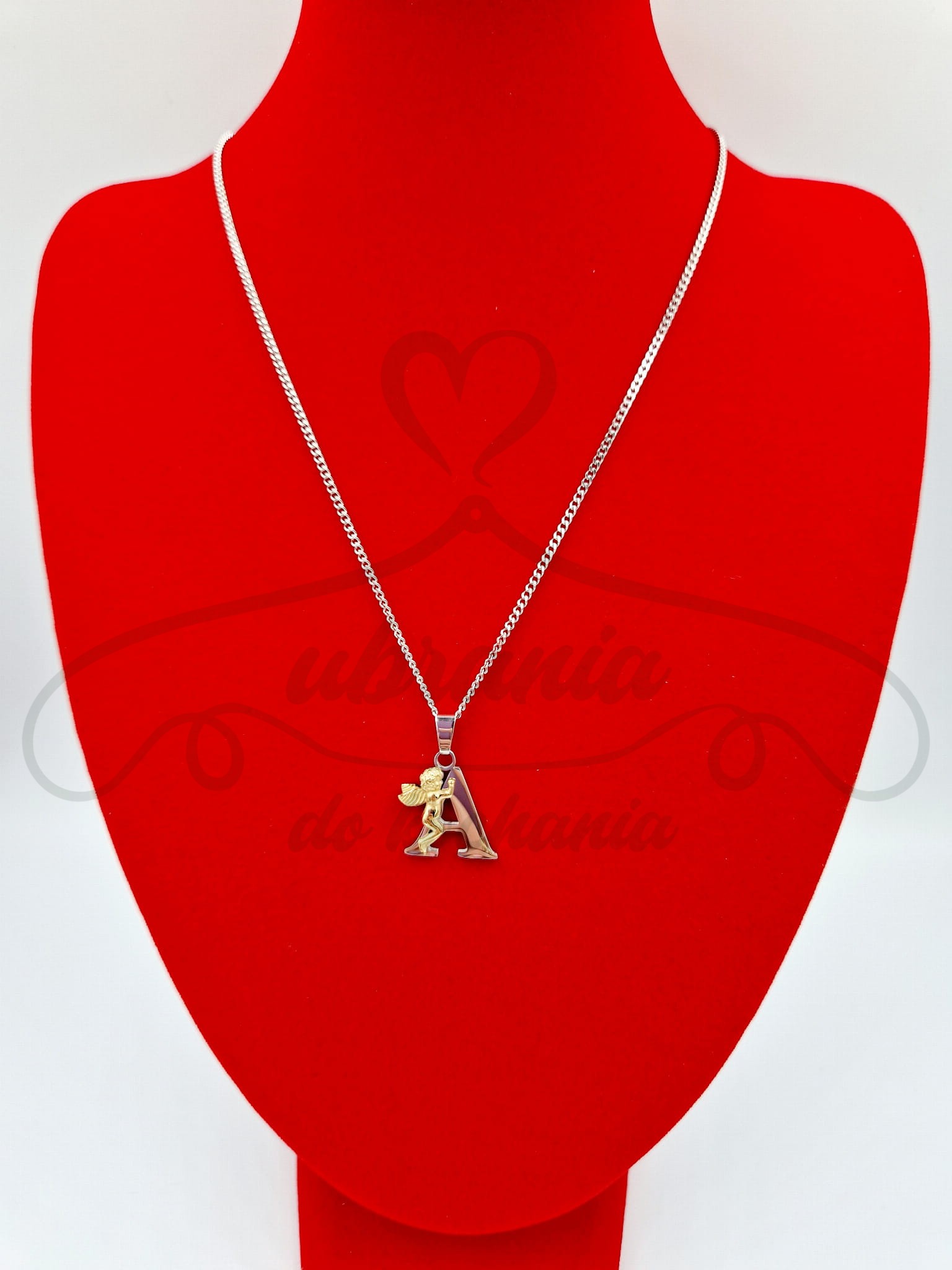 Klasyczny damski naszyjnik w kolorze srebrnym z literką oraz małym złotym aniołkiem. Naszyjnik z powodzeniem uzupełni każdą codzienną, kobiecą stylizację. Idealny pomysł na prezent.