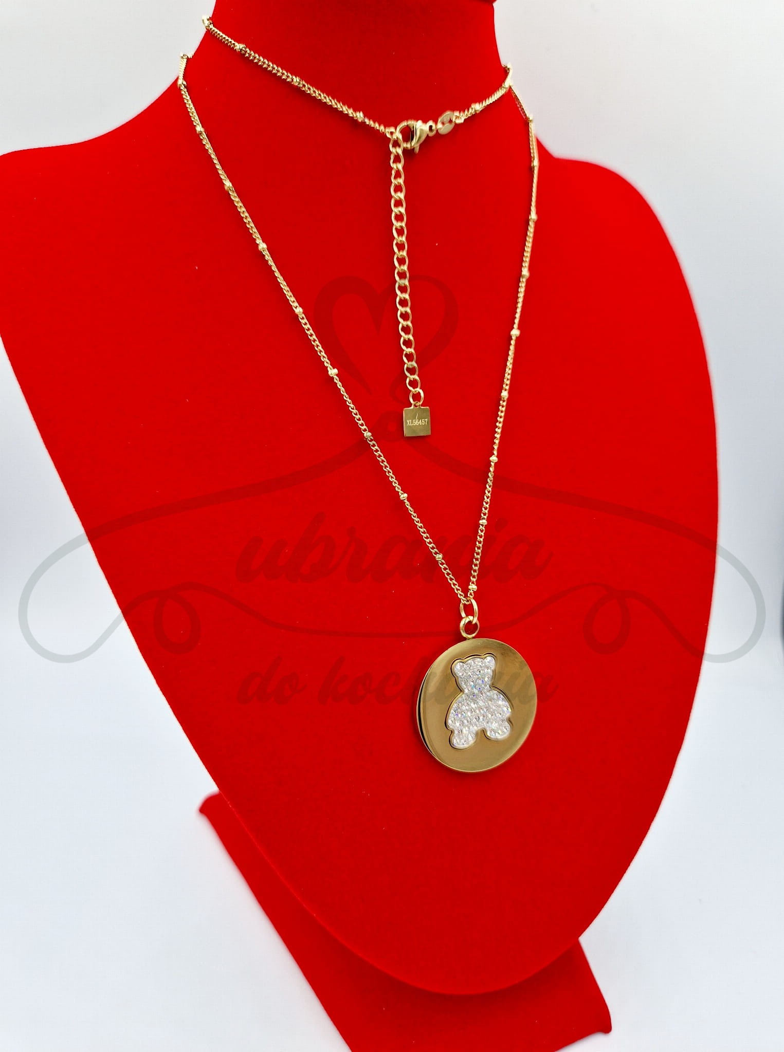 Naszyjnik damski, wisior złoty miś zawieszony na łańcuszku z cyrkoniami. Świetnie podkreśli urodę i nada niezwykłej kobiecości. Idealnie pasuje do białej bluzki oraz jeansów, czy też innego codziennego ubioru do szkoły czy do pracy. Jest delikatny, ma bardzo przyjemny dla oka kształt oraz może być idealnym prezentem dla ukochanej osoby na walentynki czy urodziny. Złote elementy wykonane w całości ze stali szlachetnej 316L.
