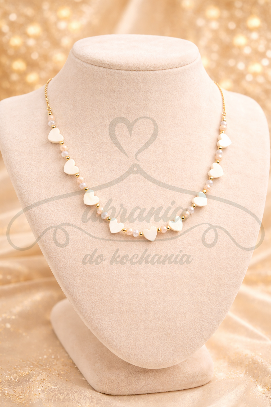 Romantyczny i kobiecy naszyjnik wykonany z masy perłowej w kształcie uroczych serduszek, przeplatanych drobnymi koralikami i złotymi akcentami. Idealny na prezent dla bliskiej osoby lub jako subtelna ozdoba Twojej codziennej stylizacji. Stal szlachetna zapewnia trwałość i komfort noszenia.