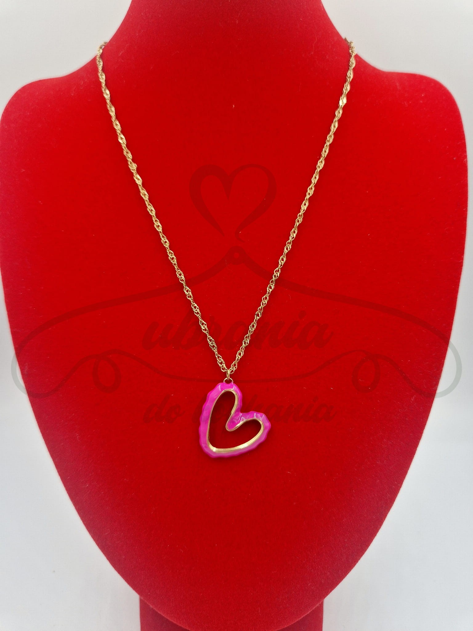 Naszyjnik w kolorze złotym na delikatnym łańcuszku z różowym sercem. Złote elementy wykonane ze stali szlachetnej.
