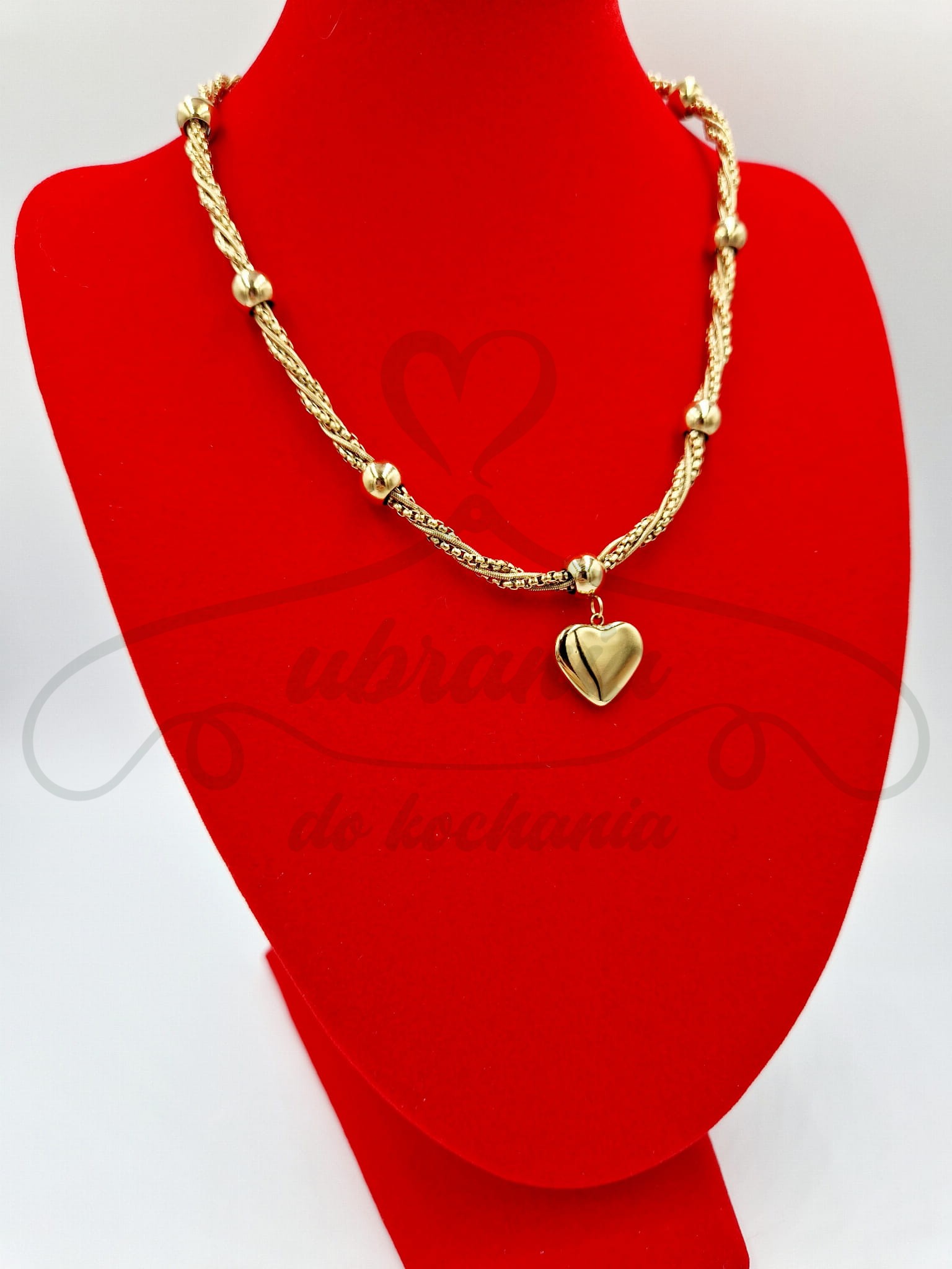 Elegancki naszyjnik wykonany z wysokiej jakości stali szlachetnej, która zachwyca trwałością i połyskiem. Zdobiony regularnie rozmieszczonymi kulkami oraz zawieszką w kształcie serca, stanowi idealne połączenie klasyki i romantyzmu. Splot łańcuszka jest subtelnie pleciony, co dodaje całości wyjątkowego charakteru. Doskonały wybór na prezent lub jako dodatek do codziennej i wieczorowej stylizacji.