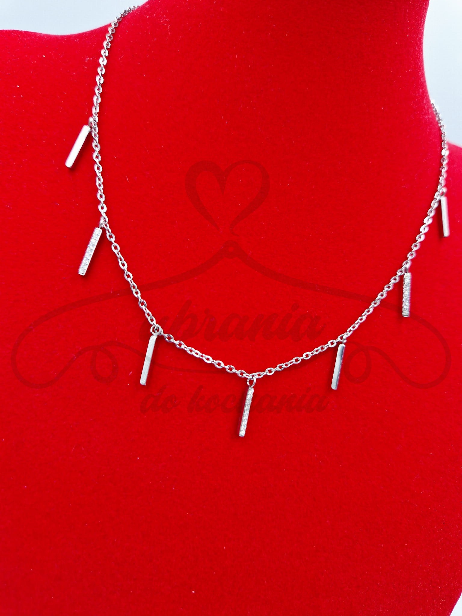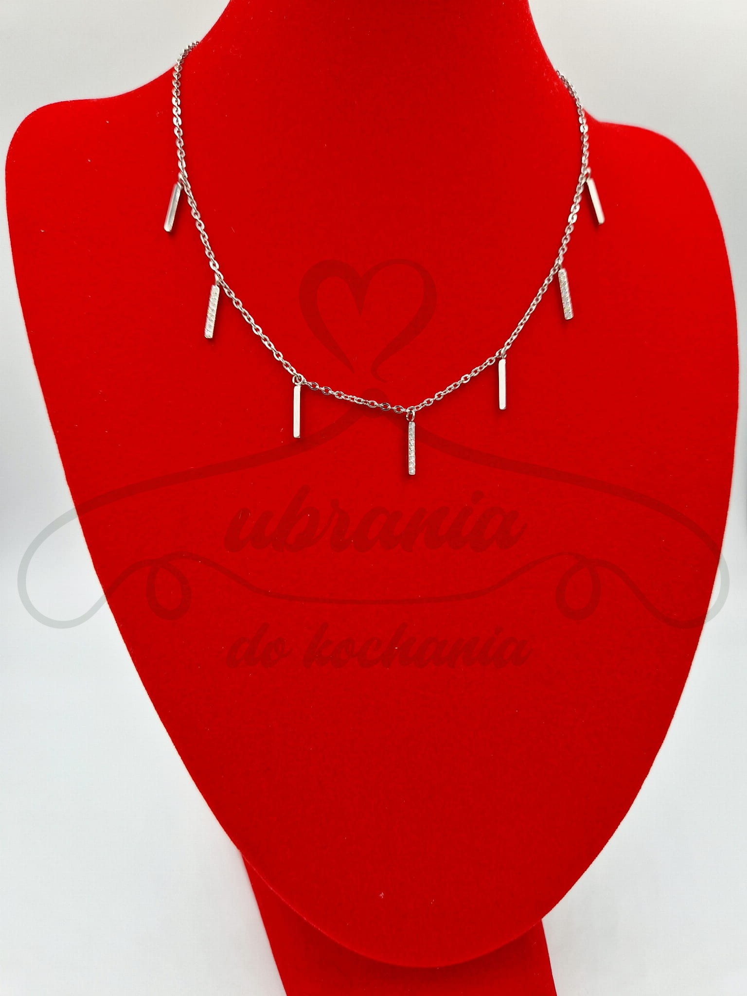 Delikatny naszyjnik w kolorze srebra, przyozdobiony małymi pałeczkami, to drobny, lecz jakże efektowny dodatek do każdego stylu ubioru i na każdą okazję. Naszyjnik ten będzie również dobrym pomysłem na prezent dla bliskiej osoby.