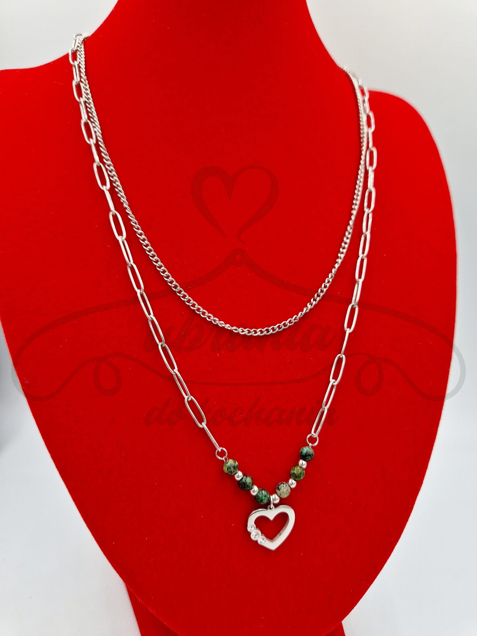 Naszyjnik podwójny w kolorze srebrnym z koralikami w kolorze zielonym oraz serduszkiem. Model pasujący do każdej stylizacji oraz idealny pomysł na prezent.