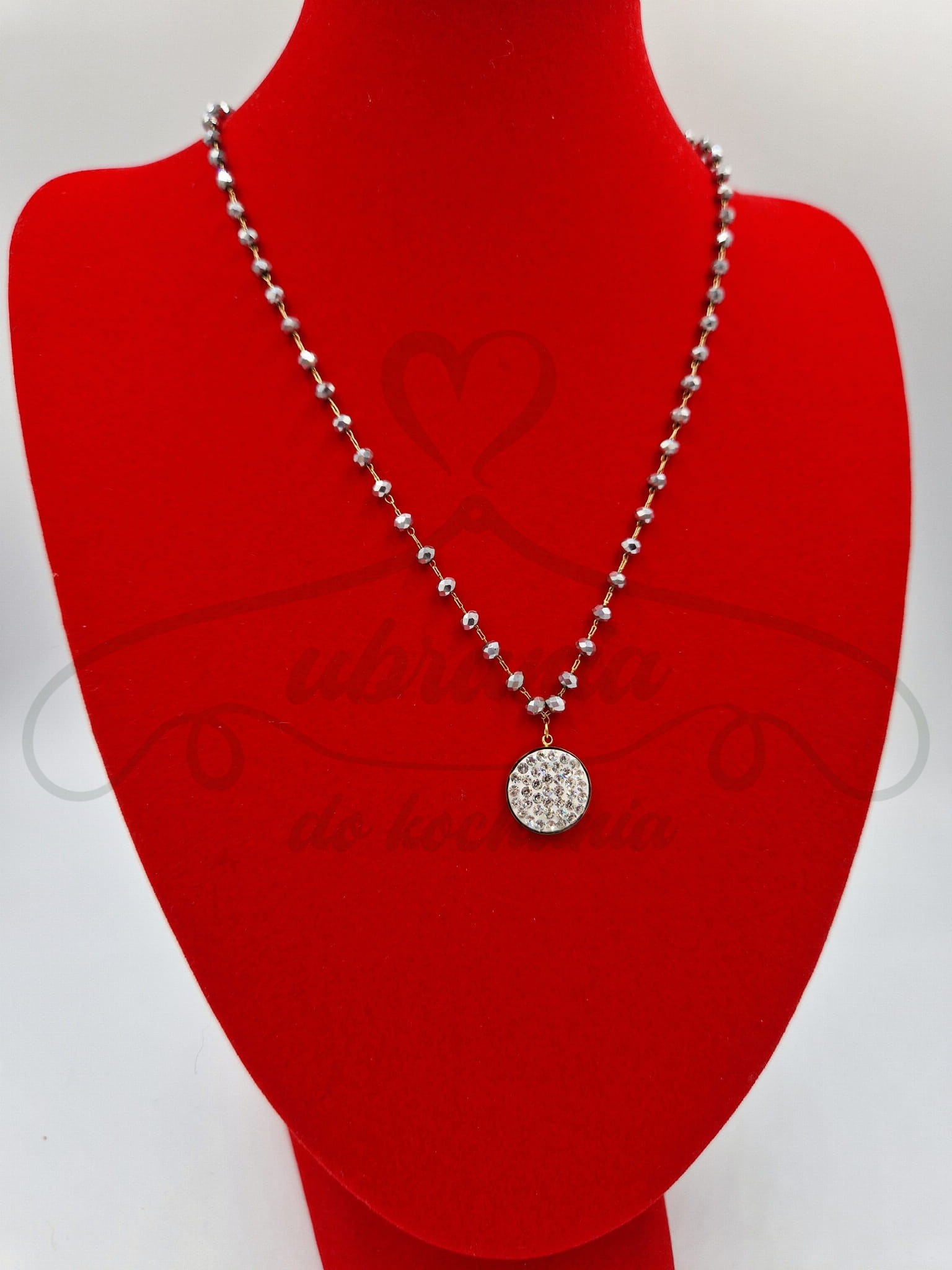 Elegancki naszyjnik wykonany z wysokiej jakości stali szlachetnej, ozdobiony drobnymi fasetowanymi koralikami, które pięknie odbijają światło. Centralnym elementem biżuterii jest okrągła zawieszka wysadzana błyszczącymi cyrkoniami, dodająca całości luksusowego charakteru.