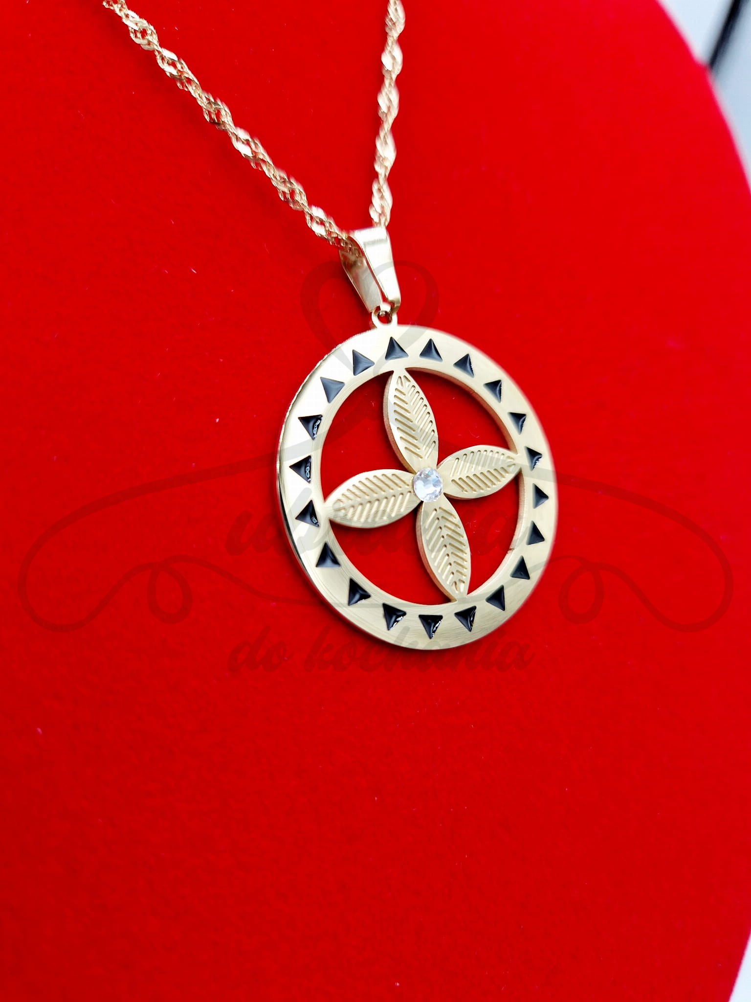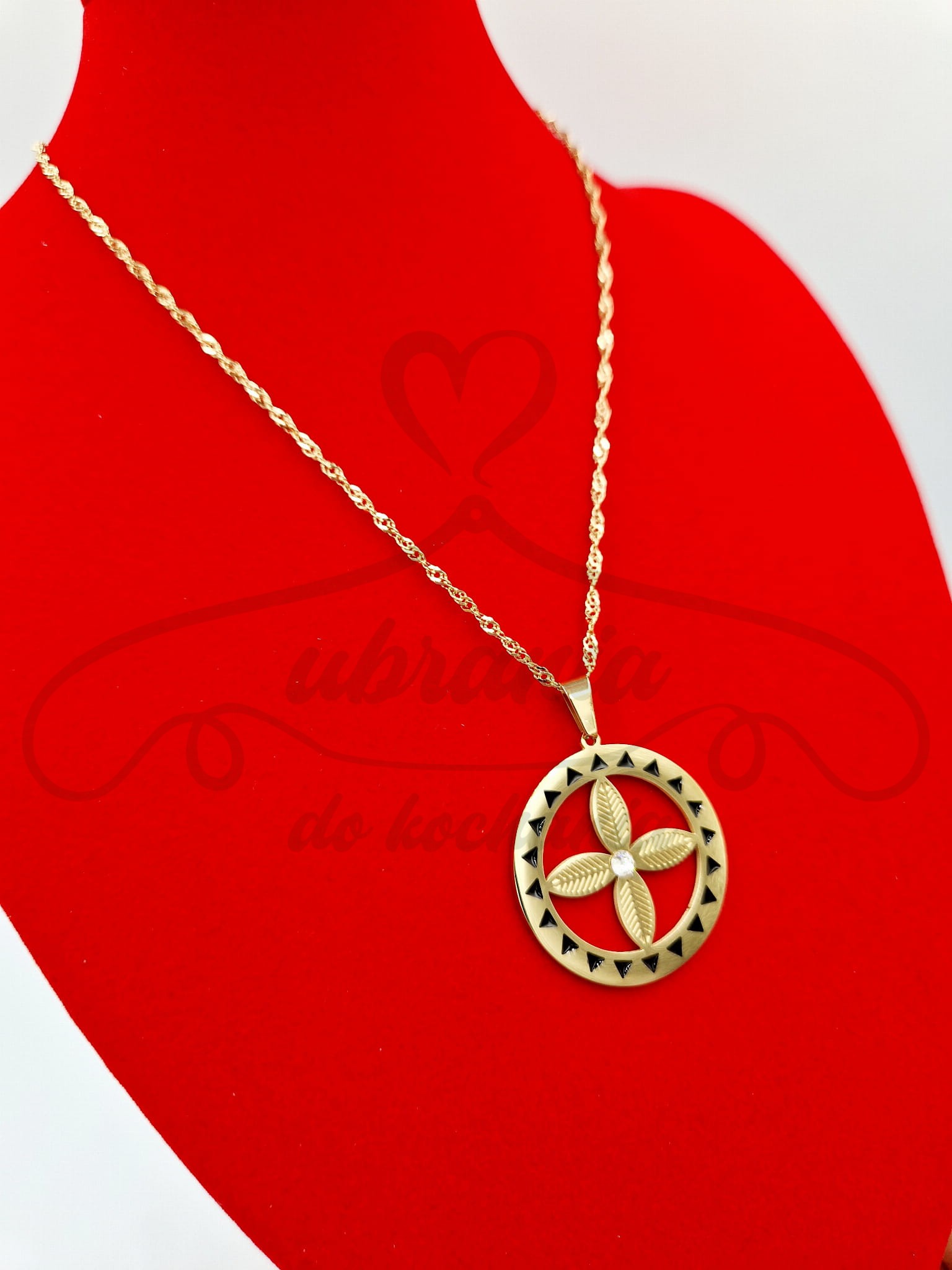 Klasyczny, damski naszyjnik w kolorze złotym na skręcanym łańcuszku. Model wzbogacony zawieszką kwiatem z cyrkonią i czarnym zdobieniem. Widoczny, błyszczący i wyjątkowo urokliwy!