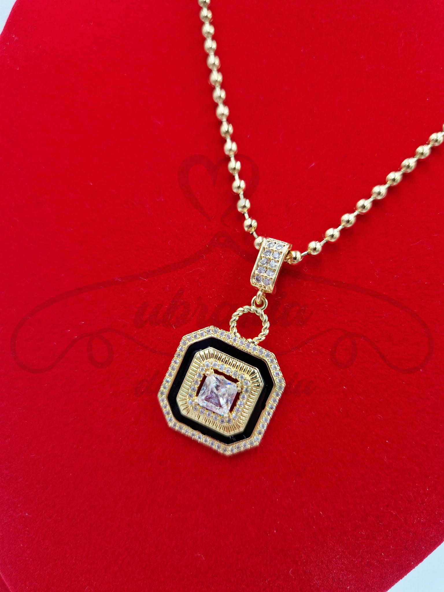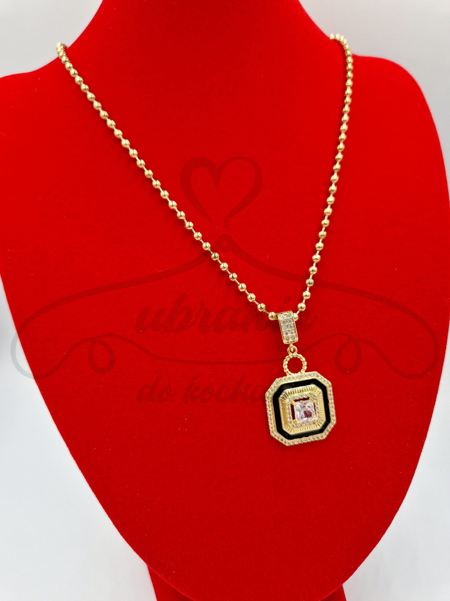 Naszyjnik ze stali szlachetnej o złotym wykończeniu to połączenie klasyki z wyrazistym stylem. Na kulkowym łańcuszku zawieszono elegancki wisiorek w geometrycznym kształcie, którego centrum zdobi połyskujący kamień w szlifie kwadratowym. Otoczony czarnym i złotym obramowaniem oraz subtelnym zdobieniem z drobnych cyrkonii, naszyjnik przyciąga spojrzenia i dodaje charakteru każdej stylizacji. Idealny wybór dla kobiet ceniących oryginalne, ale ponadczasowe dodatki. Doskonale sprawdzi się zarówno na co dzień, jak i na specjalne okazje.