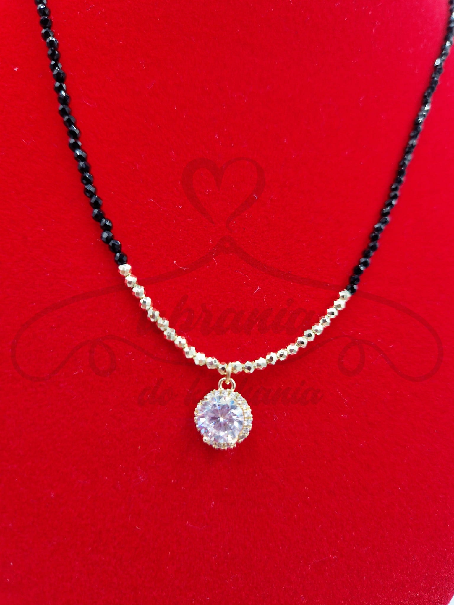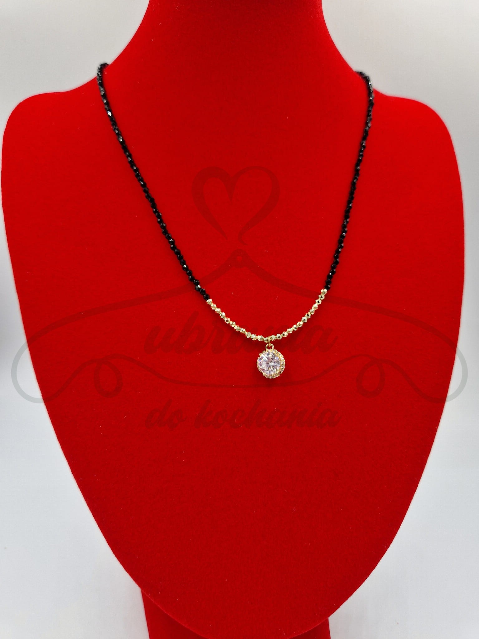 Elegancki naszyjnik wykonany z czarnych i złotych koralików, ozdobiony lśniącą zawieszką z cyrkonią. Idealny wybór dla miłośniczek subtelnej biżuterii z nutą glamour.