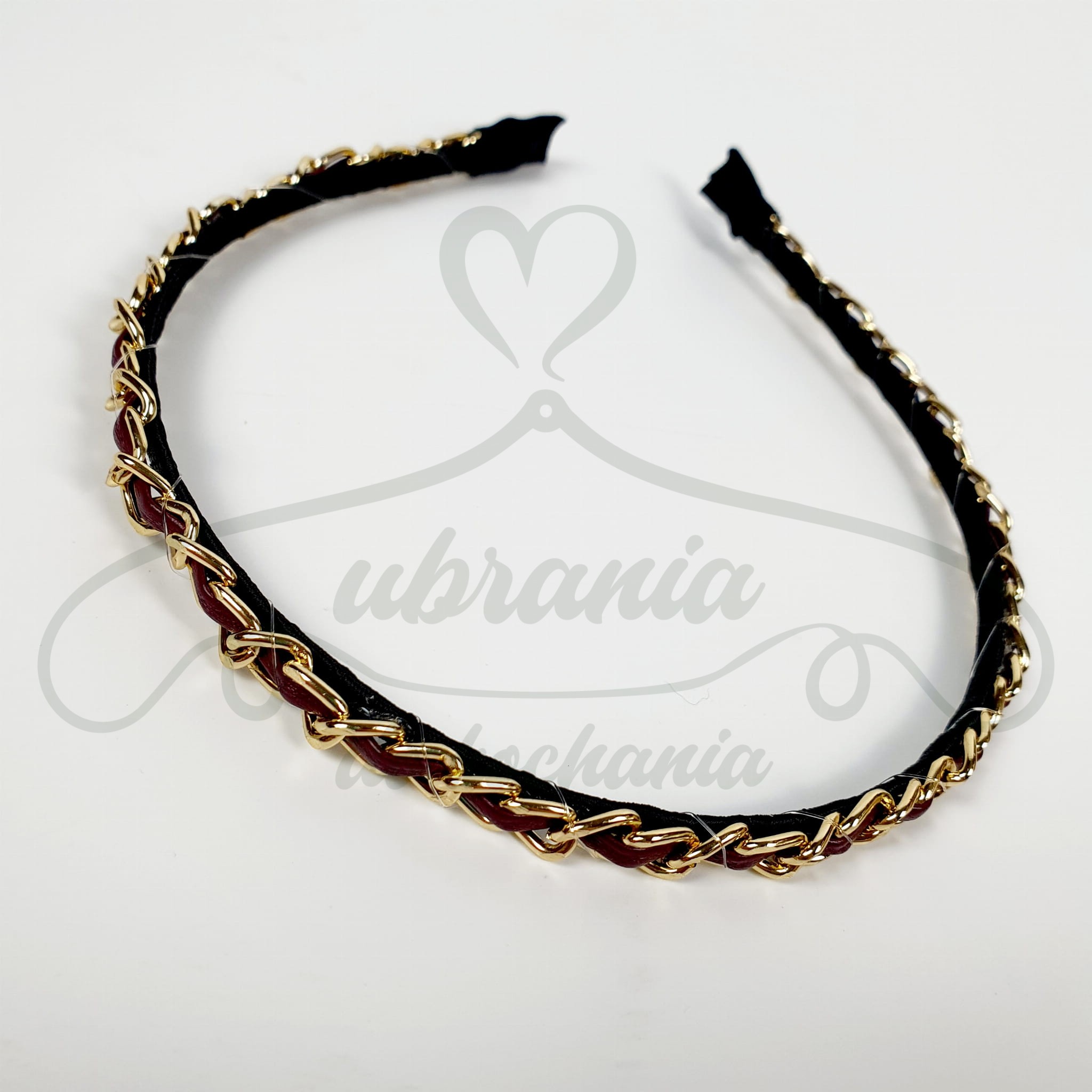 Opaska do włosów przelatana eko skórą w kolorze bordowym ze złotym łańcuszkiem. Idealnie podkreśli twoją fryzurę i doda jej uroku. Opaska nie posiada ząbków.