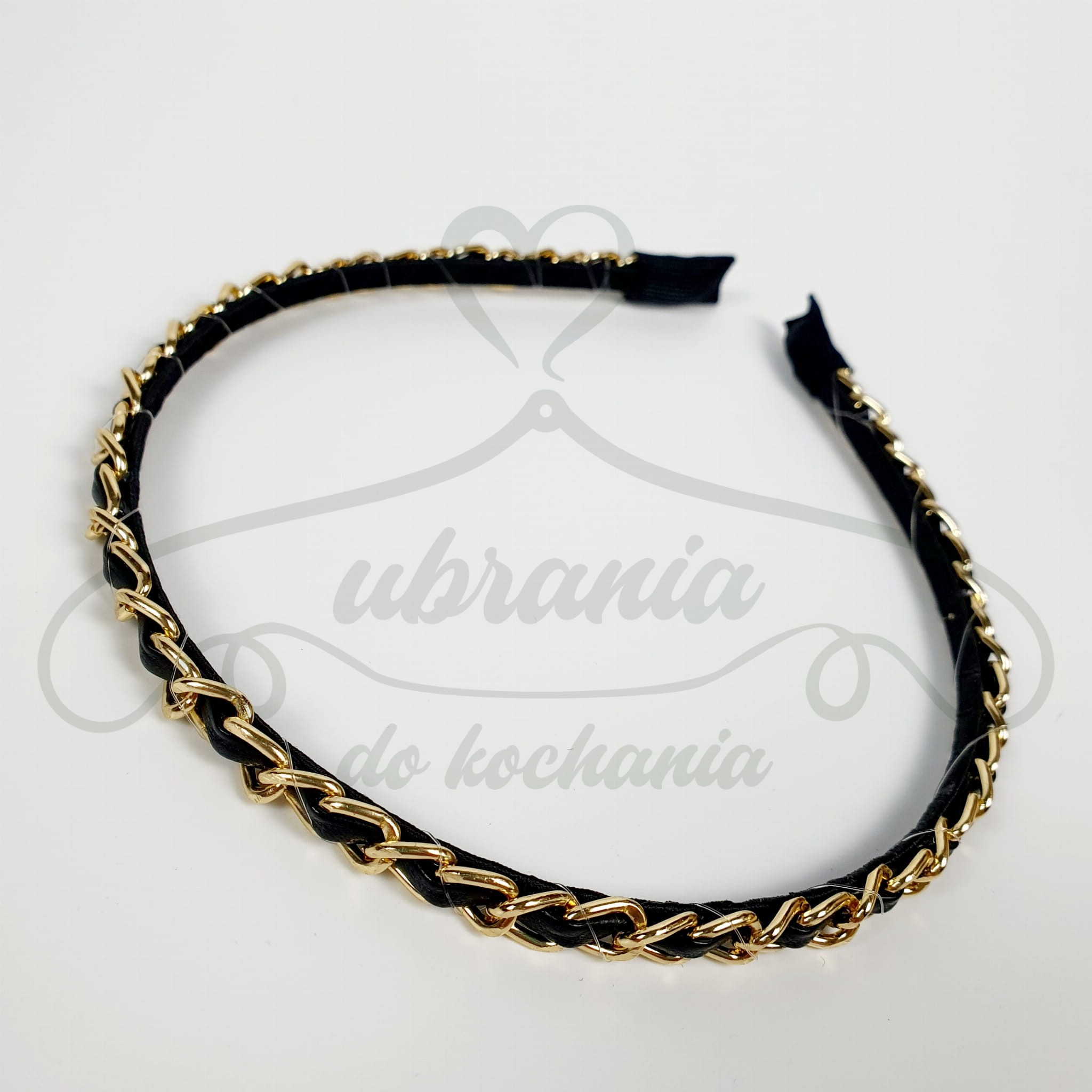 Opaska do włosów przelatana eko skórą w kolorze czarnym ze złotym łańcuszkiem. Idealnie podkreśli twoja fryzurę i doda jej uroku. Opaska nie posiada ząbków.