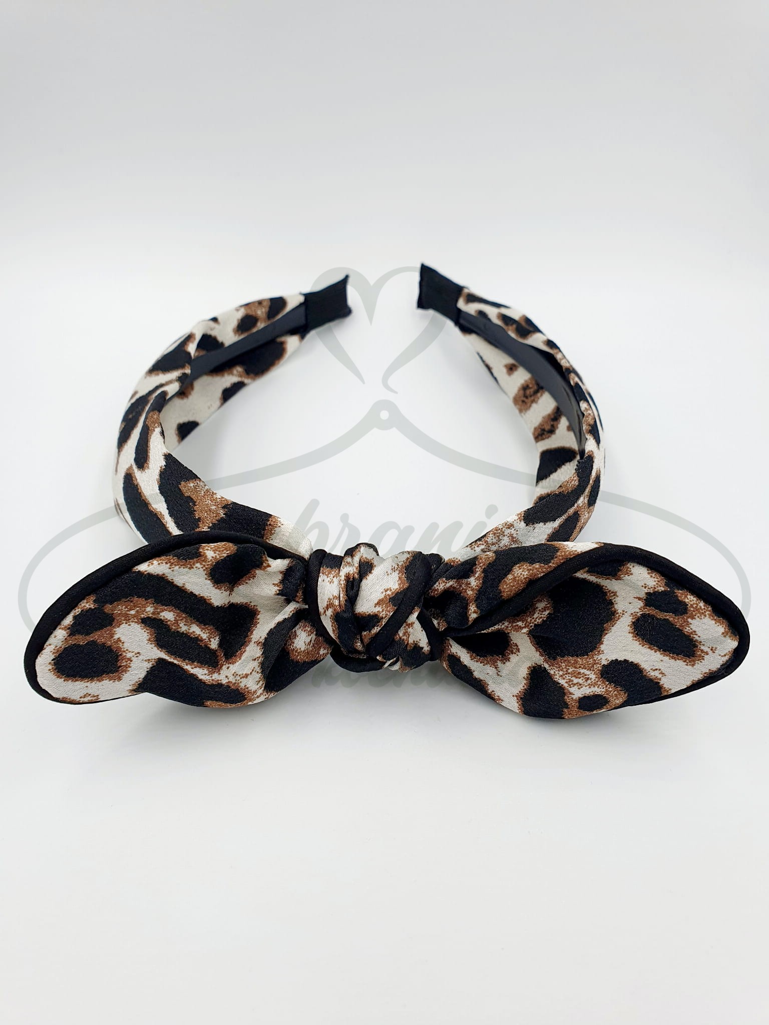 Opaska do włosów grubsza z kokardką usztywnianą, obszyta materiałem, idealnie podtrzymuje włosy. Piękna kolorystyka śmietankowa w modny wzór panterkę. Opaska posiada ząbki dzięki czemu dobrze trzyma włosy. Końce opaski obszyte materiałem, nie wbijają się w głowę.