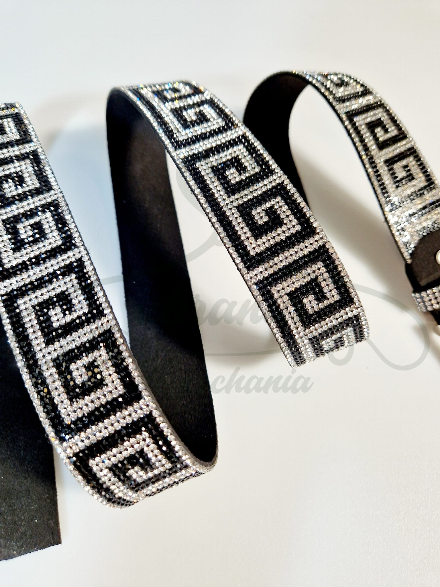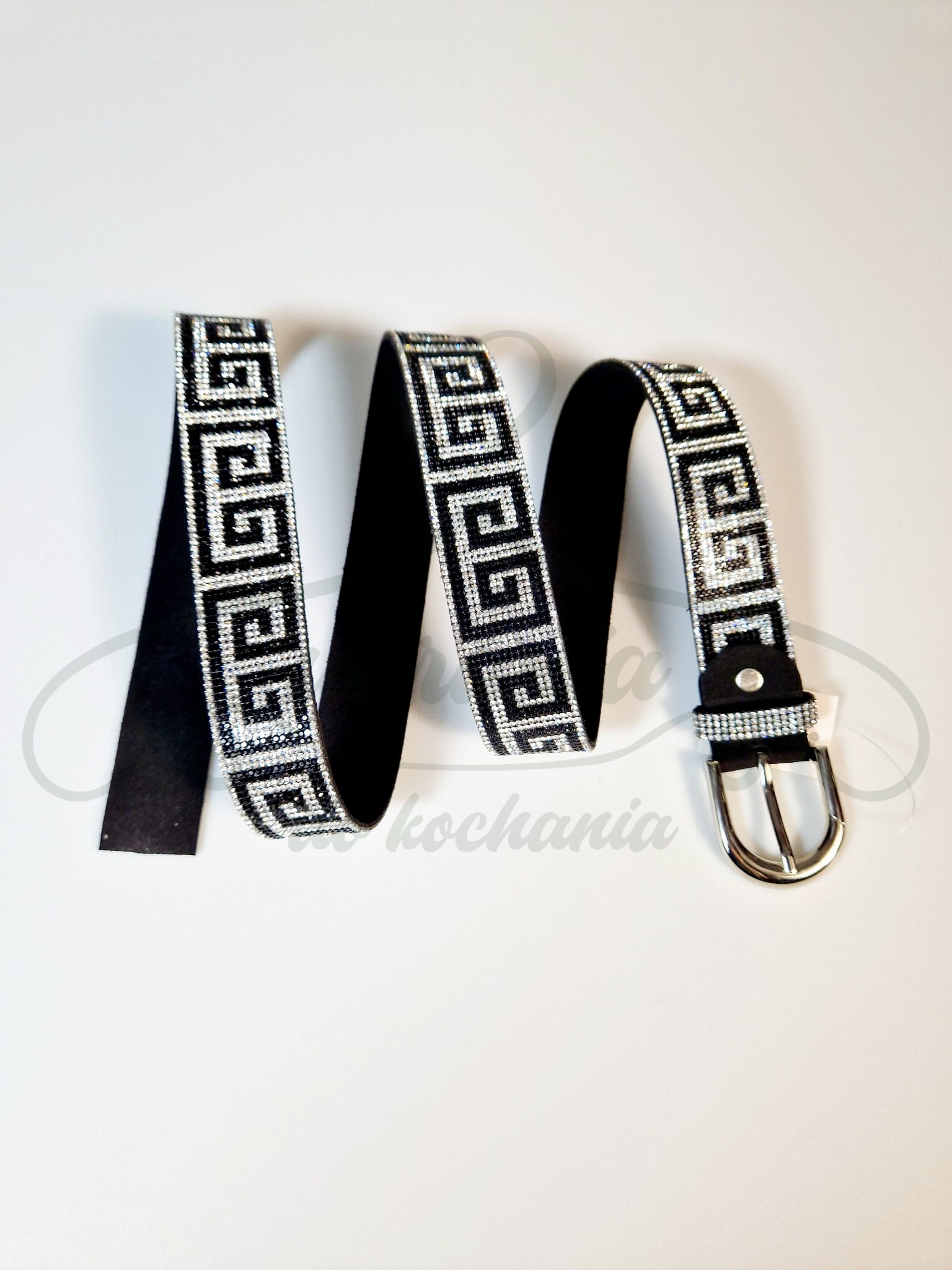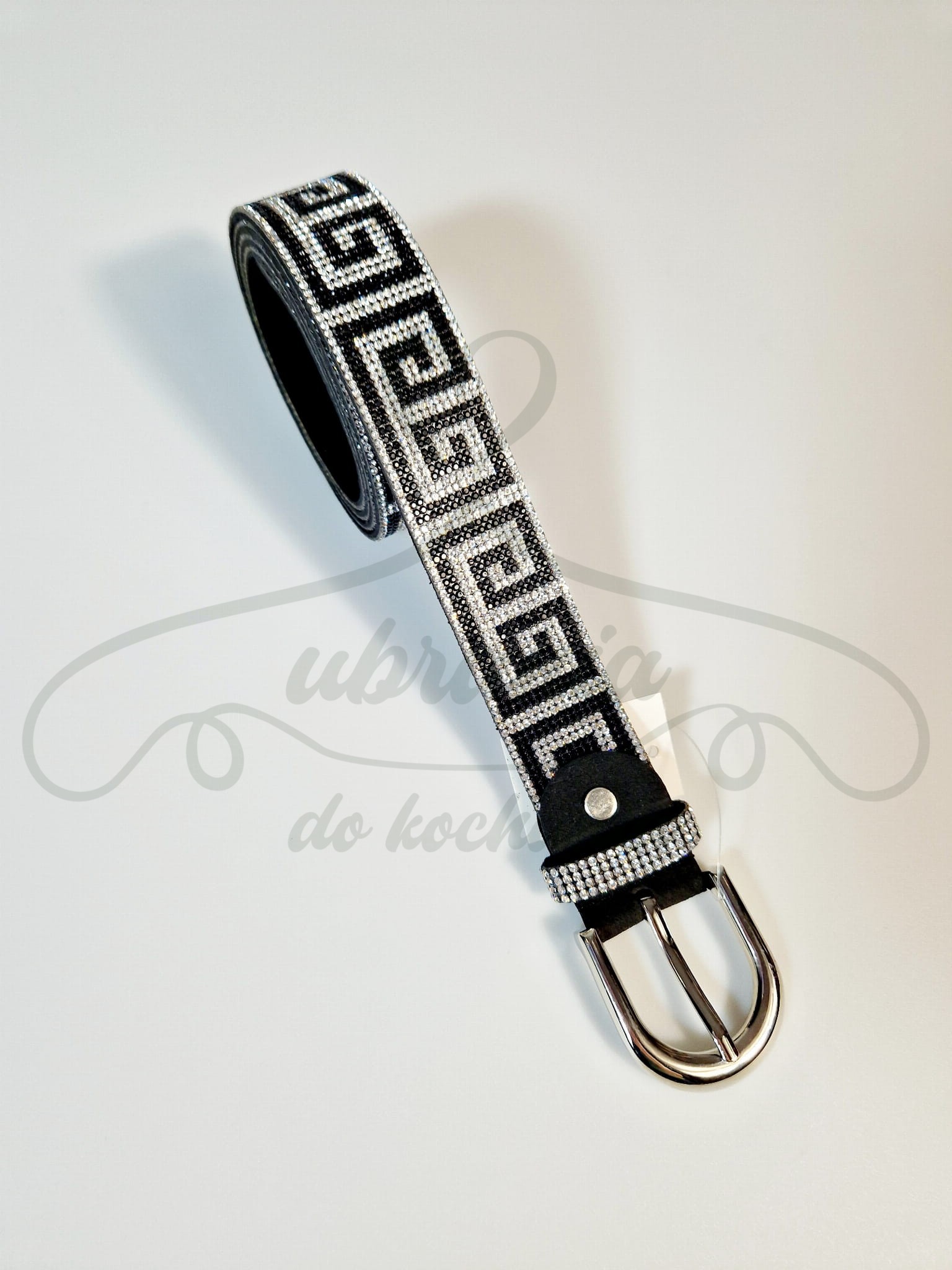 Pasek do spodni w kolorze czarnym zdobiony cyrkoniami w kolorze biało czarnym. Wykonany ze skóry ekologicznej. Idealnie pasuje do każdej wielkości szlufek w spodniach.