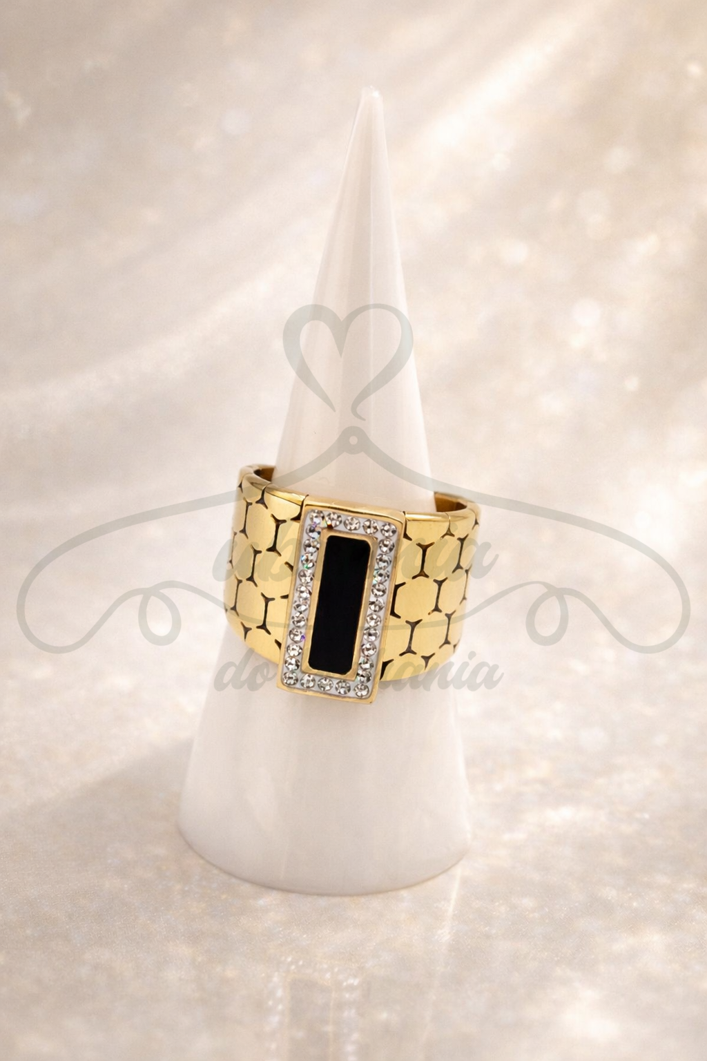 Przepiękny pierścionek w kolorze złotym z fakturą plastra miodu wraz z czarnym oczkiem. Prawdziwy HIT tego sezonu! Bardzo elegancki oraz widoczny na dłoni. Wykonany ze wysokiej jakości stali szlachetnej.