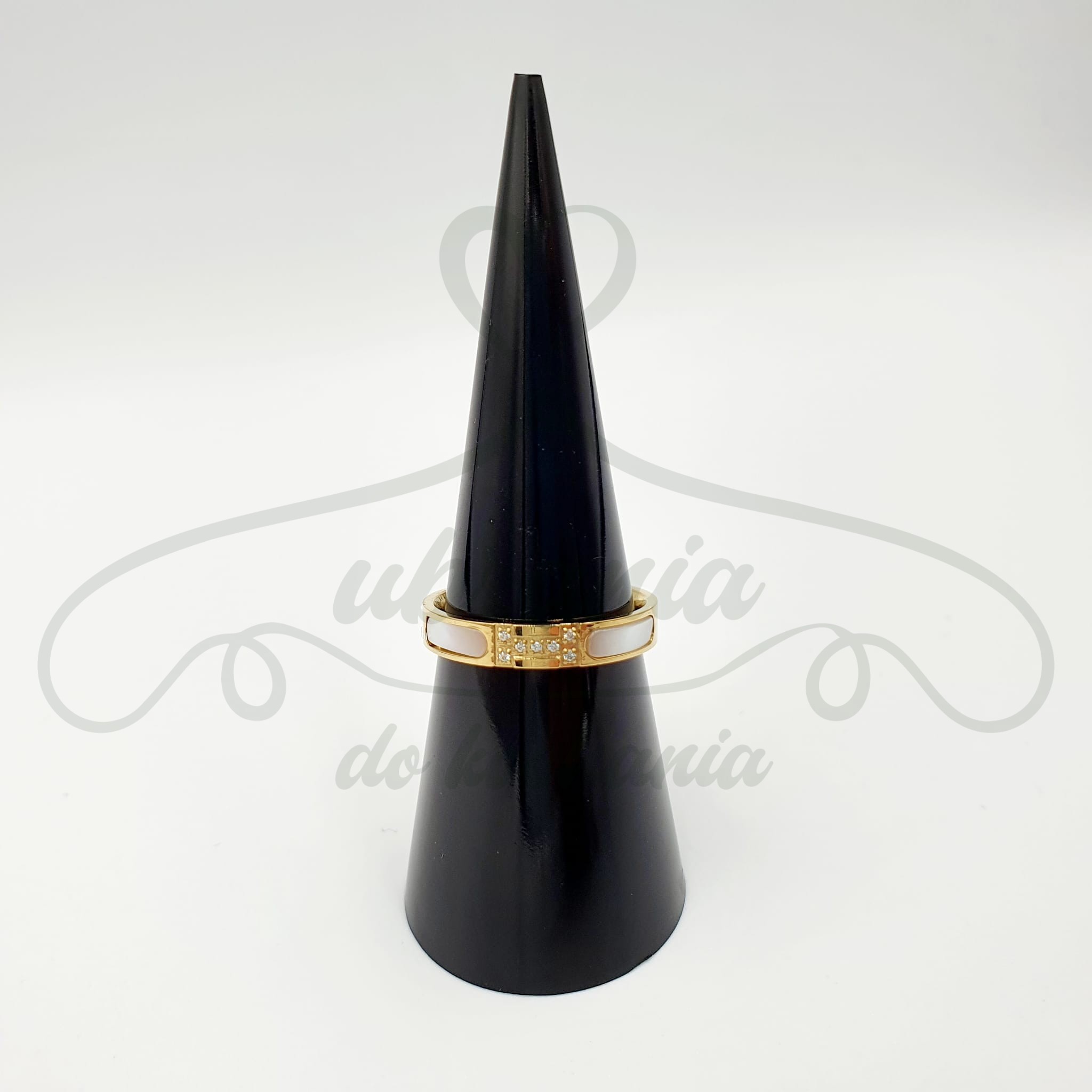 Przepiękny złoty pierścionek zdobiony białą masą perłową i cyrkoniamii wykonany ze wysokiej jakości stali chirurgicznej 316L.