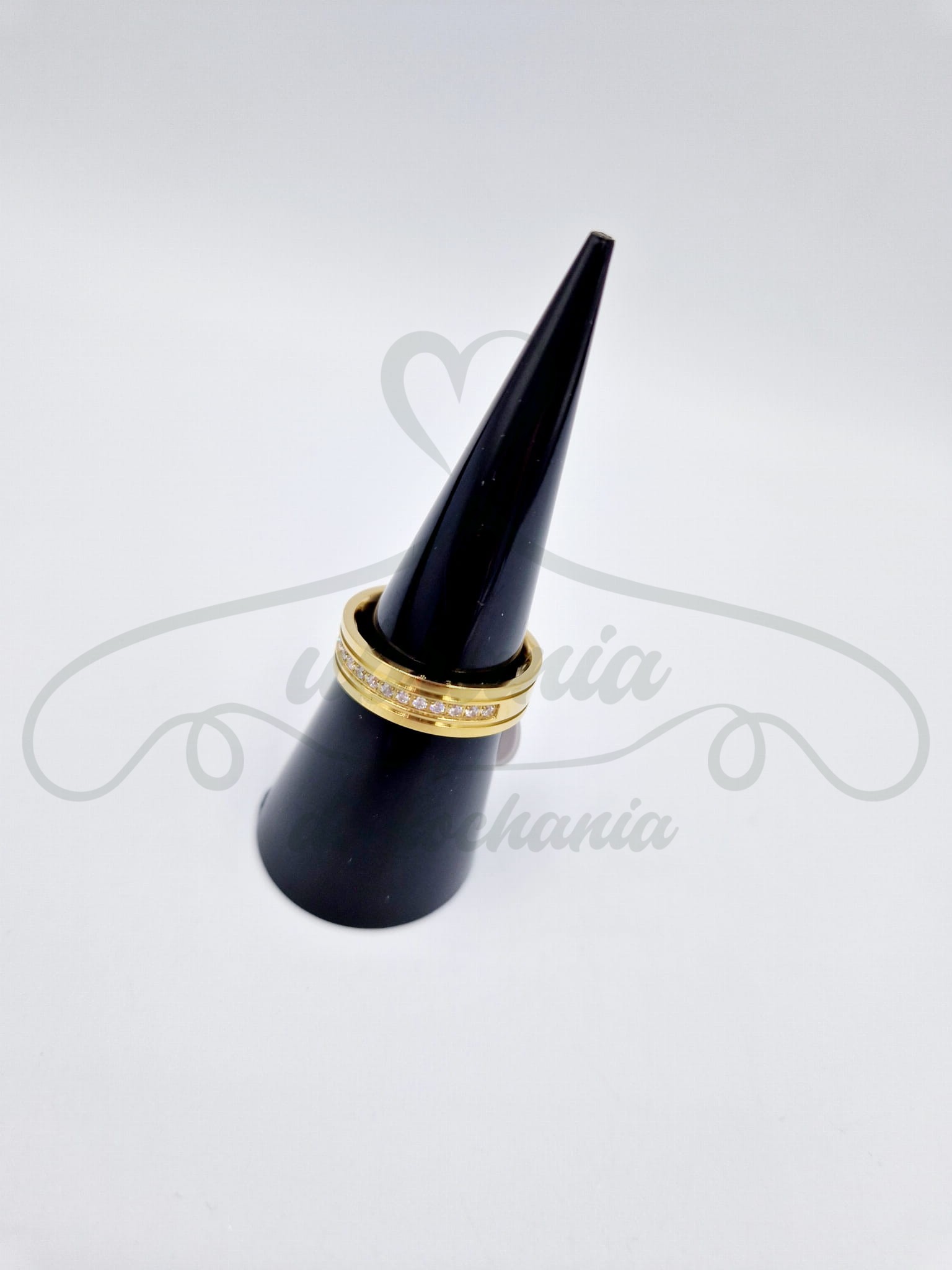Przepiękny pierścionek w kolorze złotym wykonany ze wysokiej jakości stali szlachetnej, zdobiony cyrkoniami w kolorze białym.