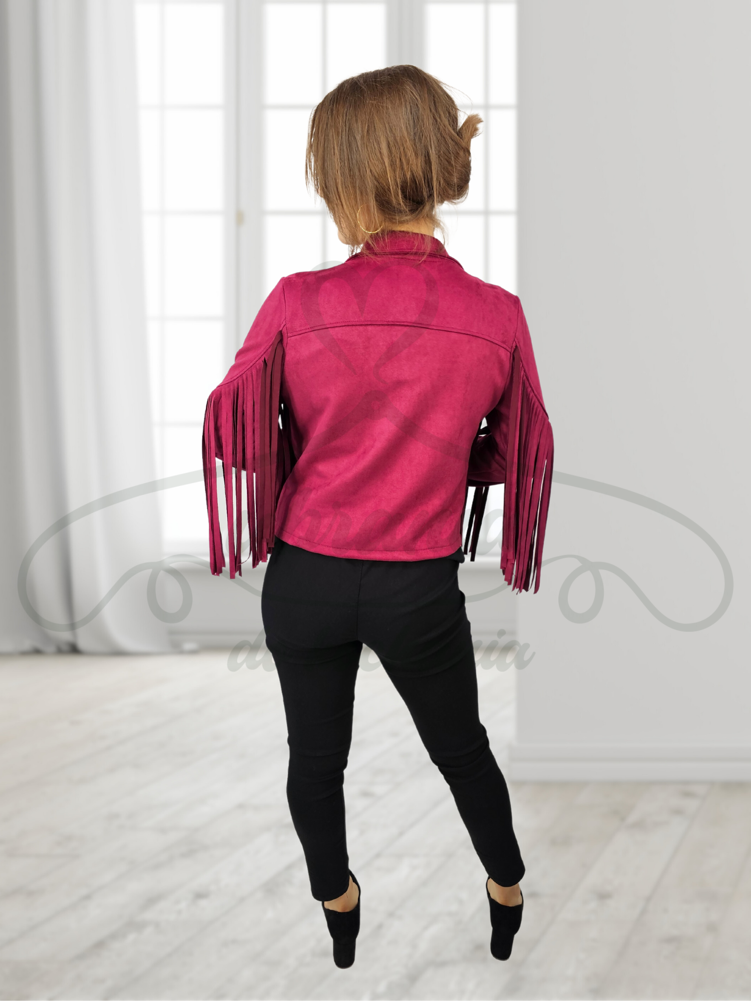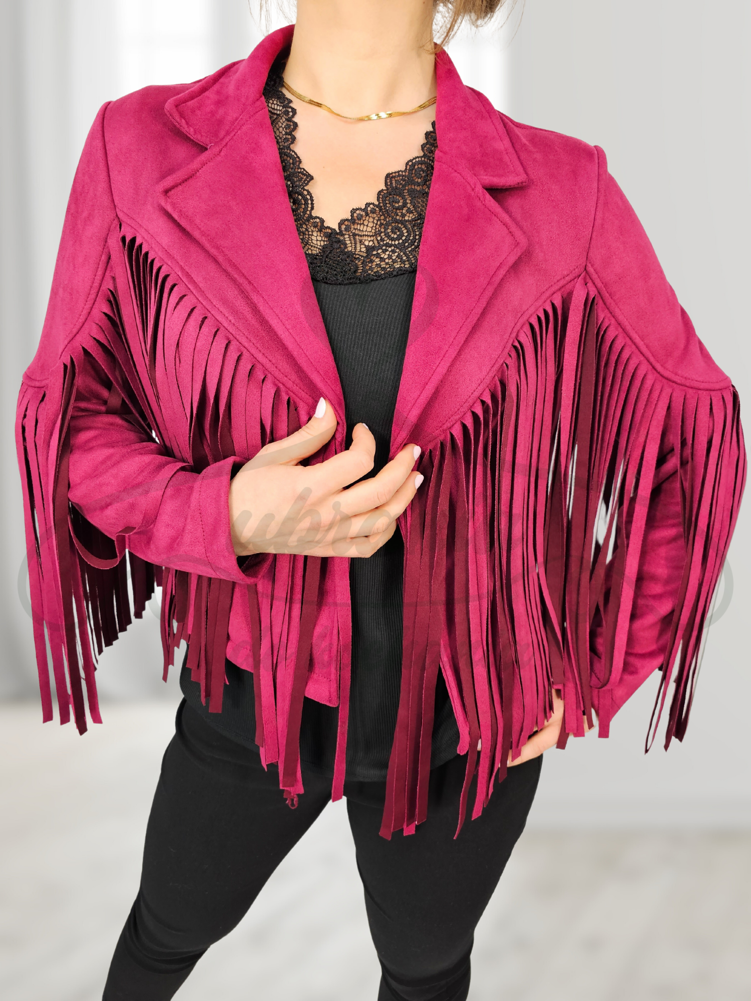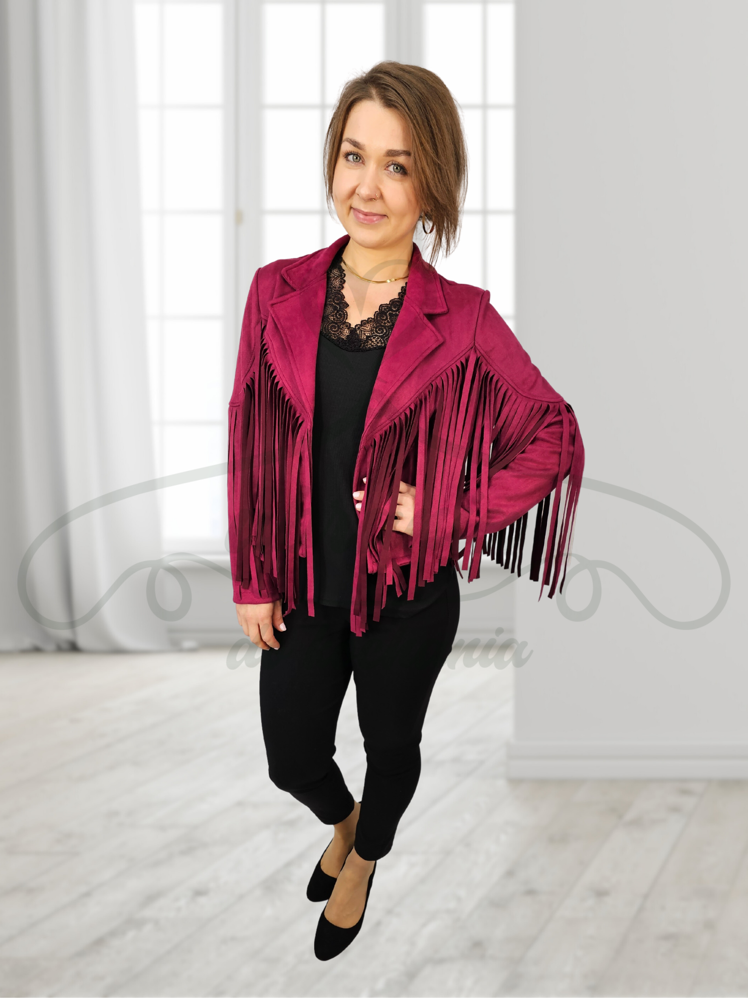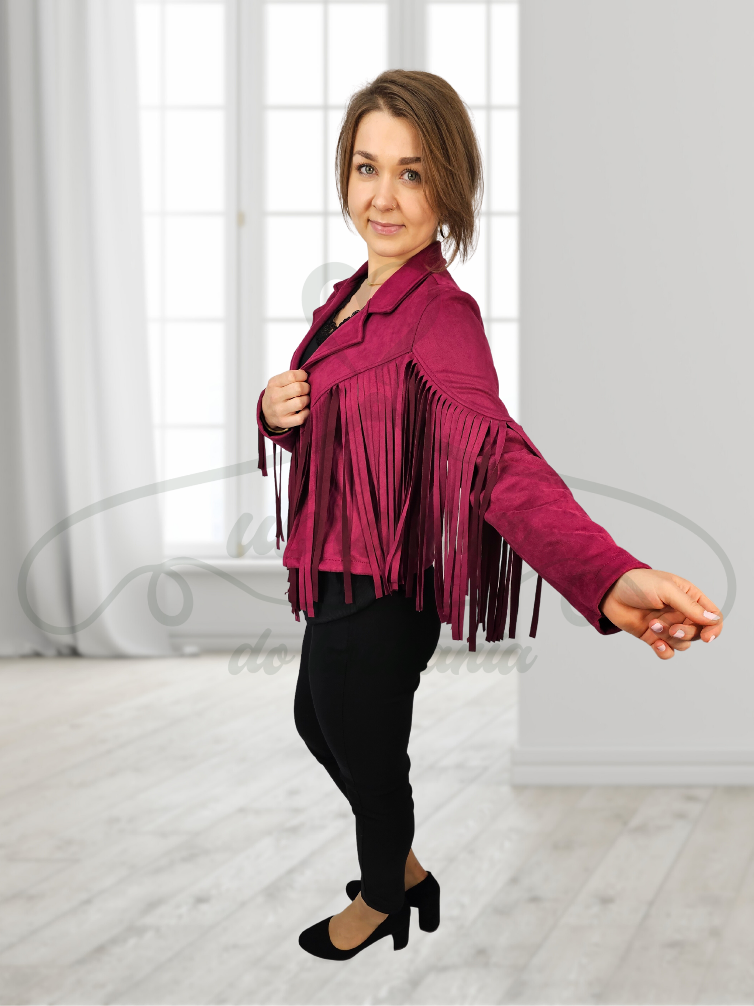Modna, bordowa ramoneska z eko zamszu ze stylowymi frędzlami. Idealna na dopełnienie każdej stylizacji! Model krótki w formie narzutki, bez zapięcia