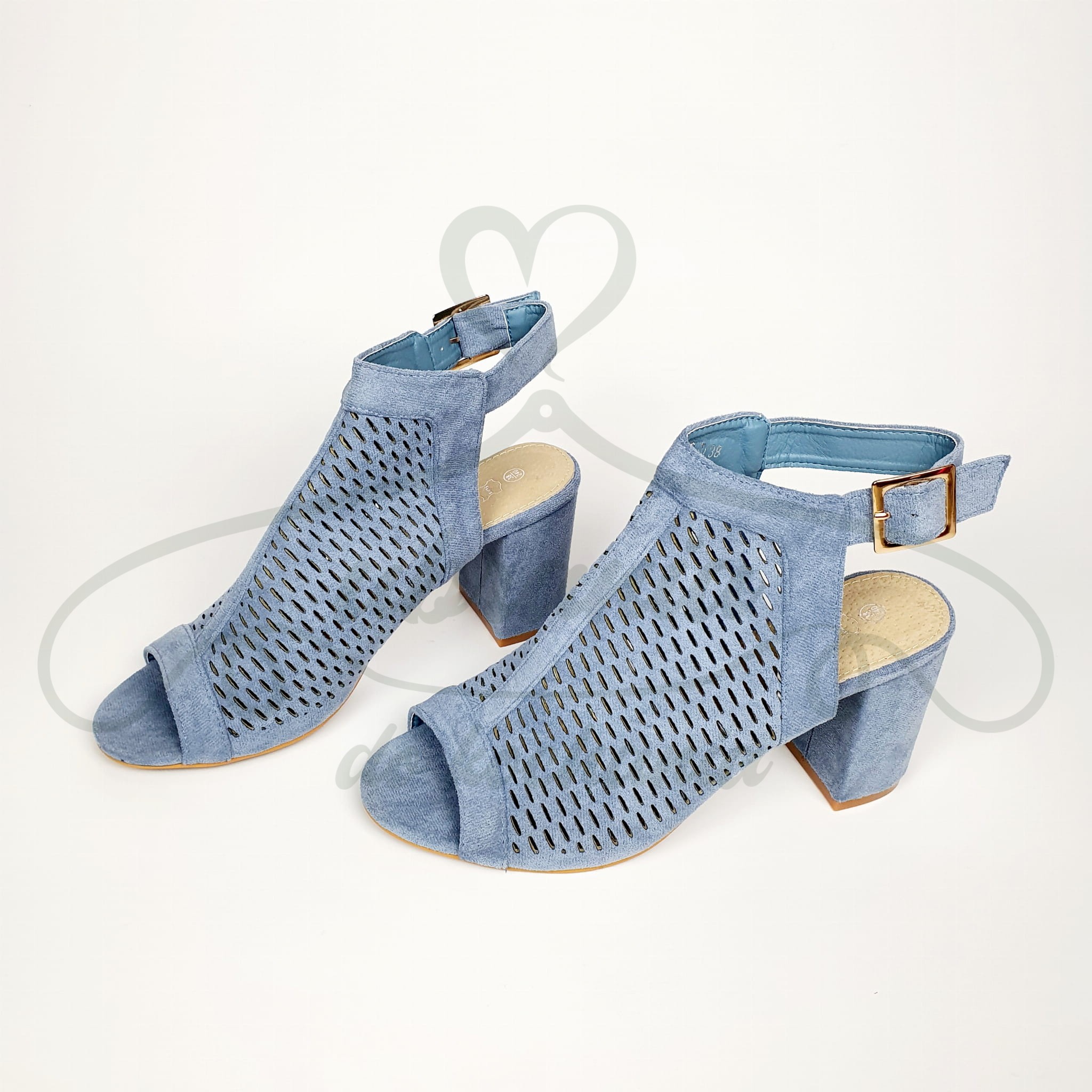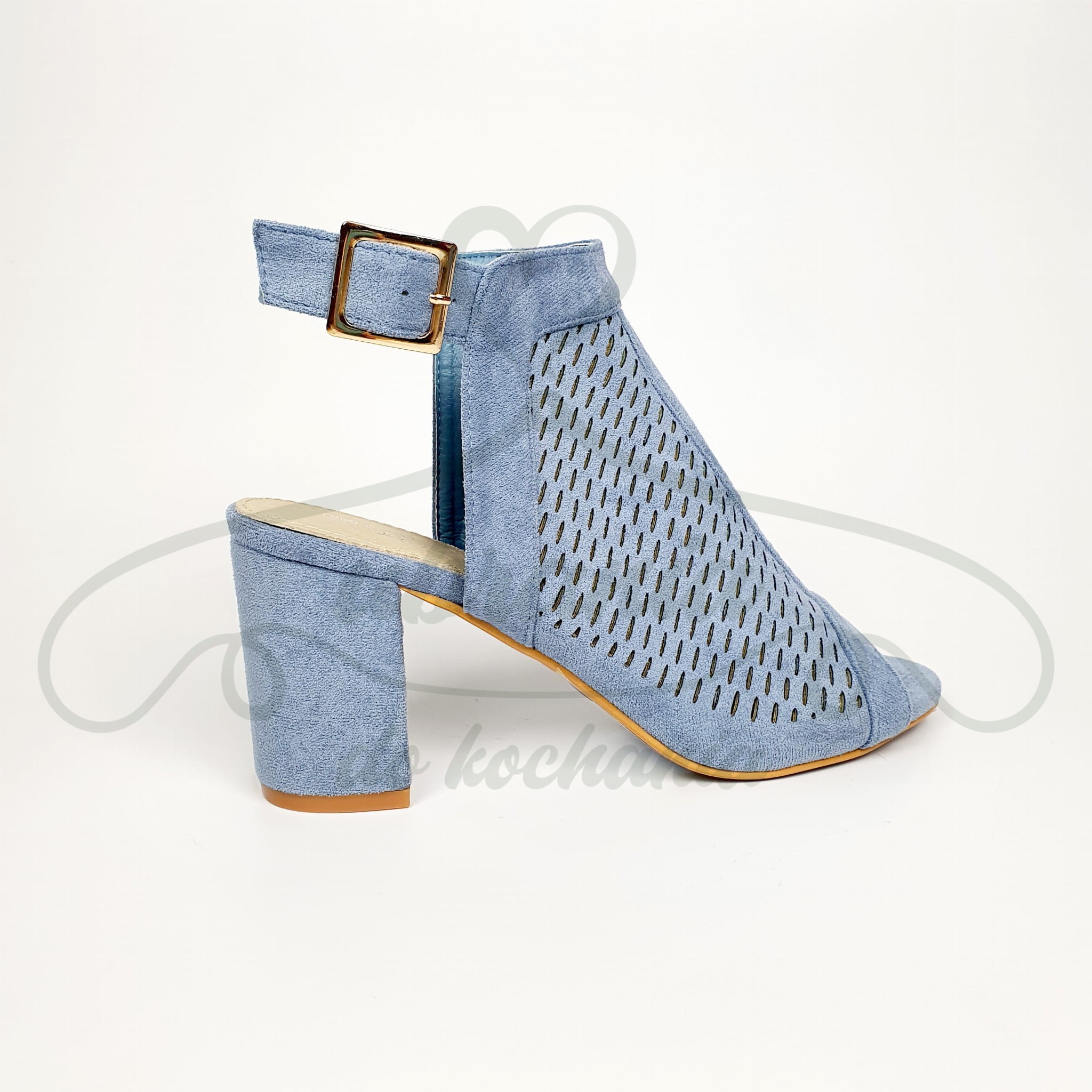 Eleganckie sandały w kolorze niebieskim na stabilnym słupku, wykonane z miękkiego zamszu ekologicznego z ażurowym wykończeniem. Cholewka z wyciętym noskiem i piętą. Zapinane są złotą sprzączką. Świetny dodatek do długiej spódnicy i sukienek.