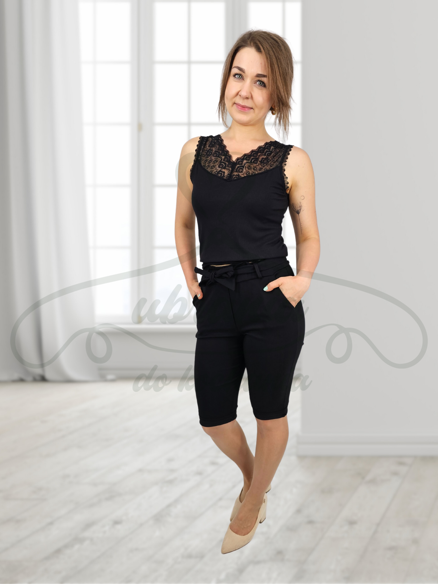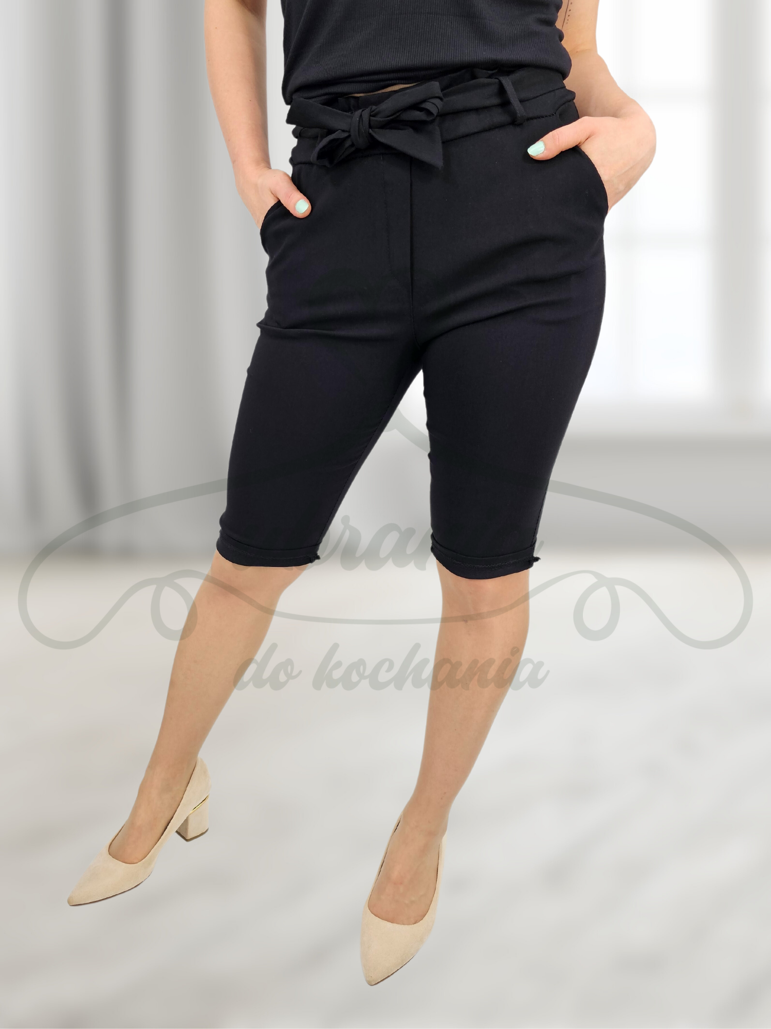 Materiałowe spodnie z paskiem w kolorze czarnym. Model idealny na letnie dni, spodnie sięgają w okolice kolan. W pasie posiadają gumę oraz ozdobny pasek w takim samym kolorze. Kieszenie z przodu po obu stronach oraz wysoki stan. Spodnie są wykonane z dobrej jakości materiału nie krepującego ruchów.