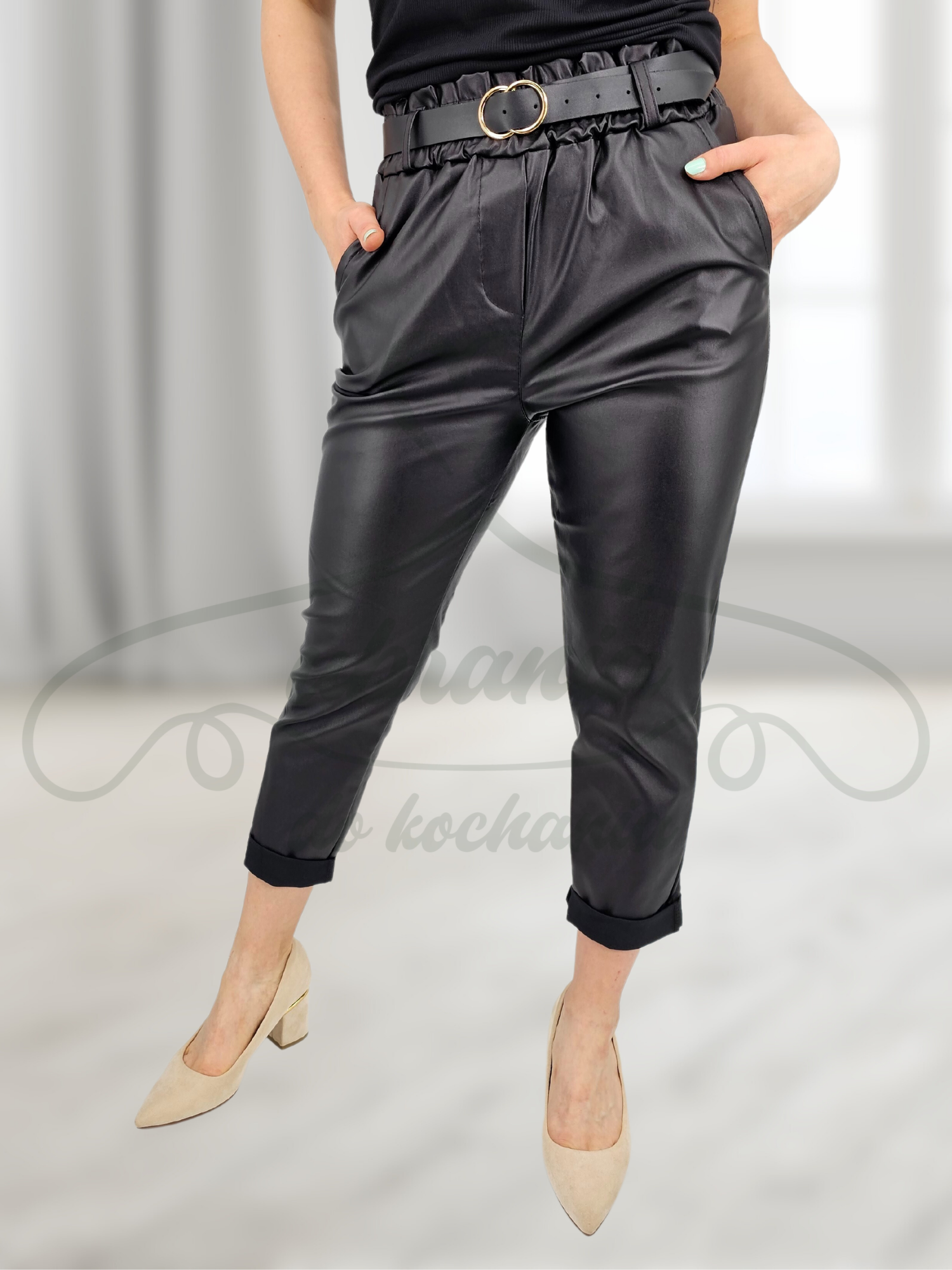Spodnie z ekoskóry w kolorze czarnym z kieszeniami. W pasie posiadają pasek z klamrą podkreślającą wcięcie w talii oraz wysoki stan z szeroką marszczoną gumą. Idealne do noszenia w połączeniu z marynarką, tuniką. W innym wydaniu prezentują się świetnie z koronkową bluzką! Eleganckie skórkowe spodnie z wysokim stanem. Dopasowany fason podkreśla kobiecą sylwetkę.