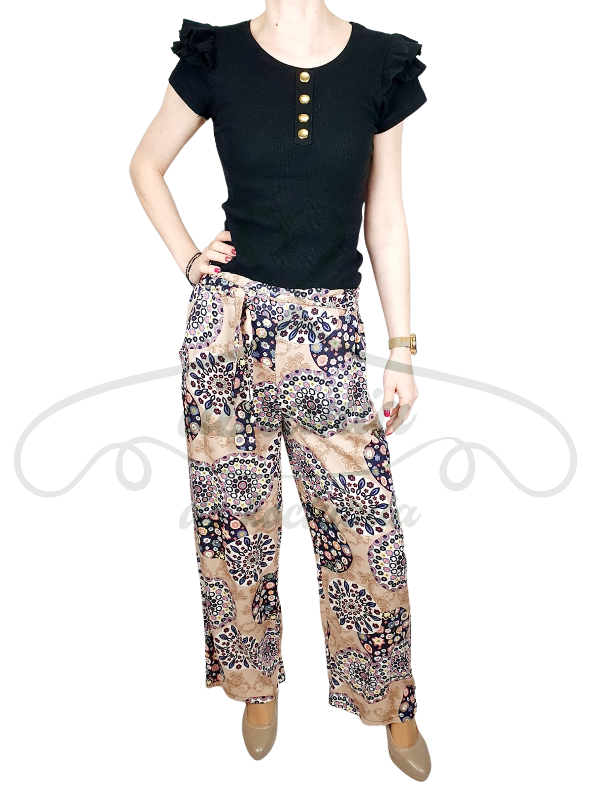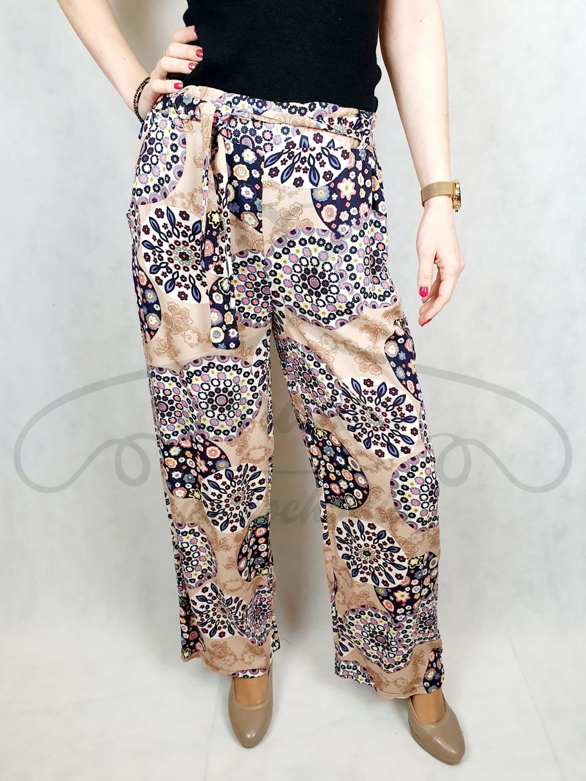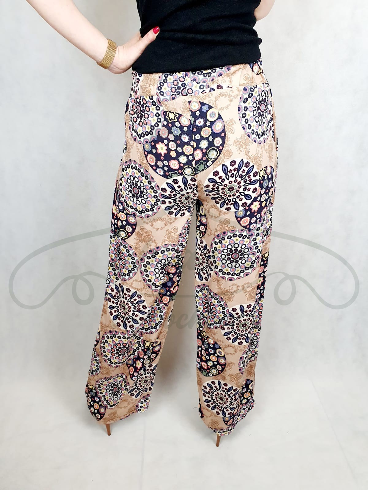 Spodnie materiałowe we wzór drobnych kwiatów ułożonych w okręgi, luźne z prostą nogawką. Pas na szerokiej gumce, z przodu wykończony szerokimi sznurkami z tego samego materiału do samodzielnego związania. Świetnie pasują zarówno do sportowego obuwia jak i butów na obcasie.