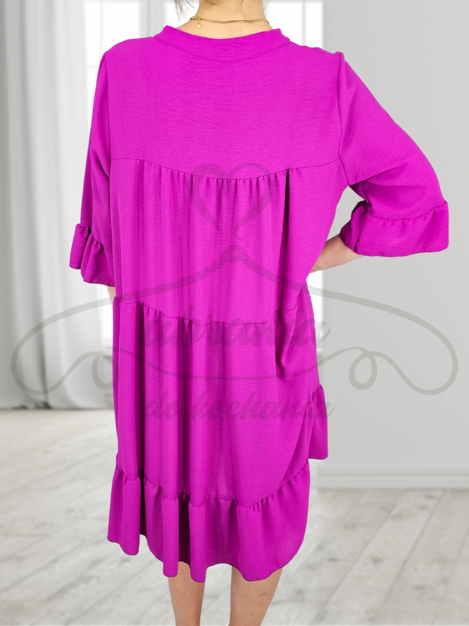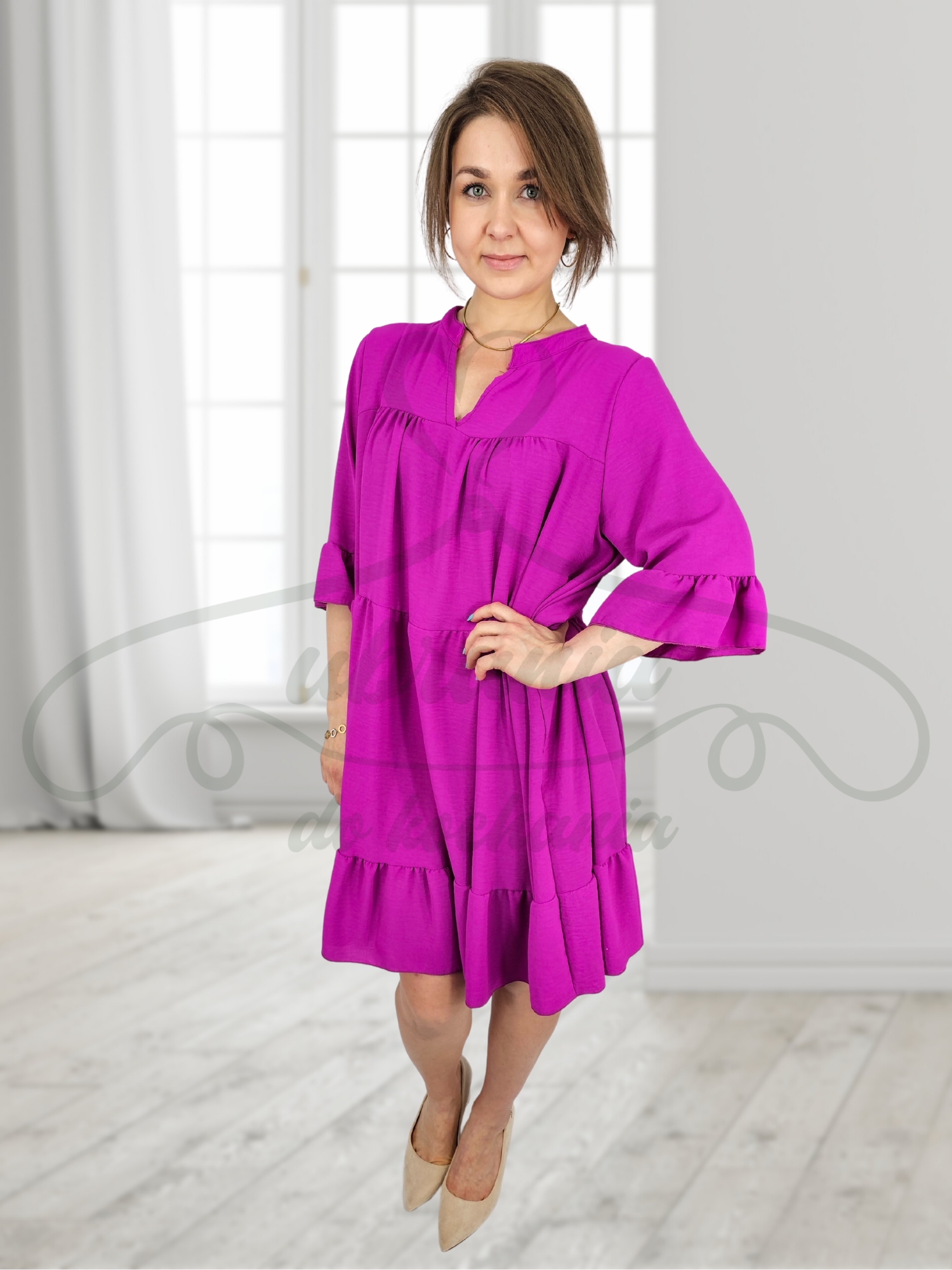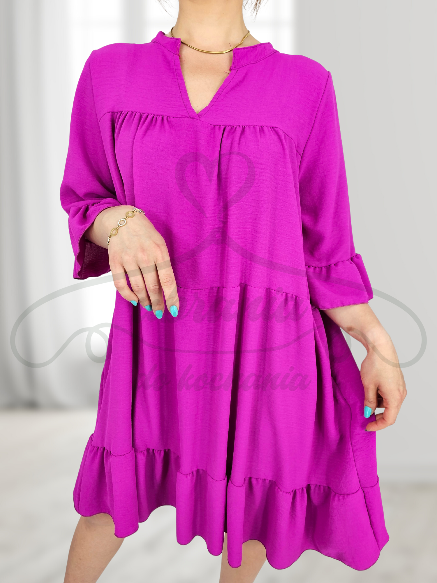 Fenomenalna, kobieca, oversize'owa sukienka. Najmodniejsze w tym sezonie falbany! Luźny, tuszujący, lekko trapezowy fason, wygodny i stylowy. Rękawy 7/8, zakończone falbaną, dekolt w serek. Idealnie się układa, pięknie eksponuje nogi. Tkanina zwiewna, lekka, wygodna. Niesamowita zarówno w połączeniu z sandałkami, botkami jak i szpilkami. Sukienka o uniwersalnym charakterze. Pięknie będzie wyglądać w połączeniu z paskiem jak i bez.