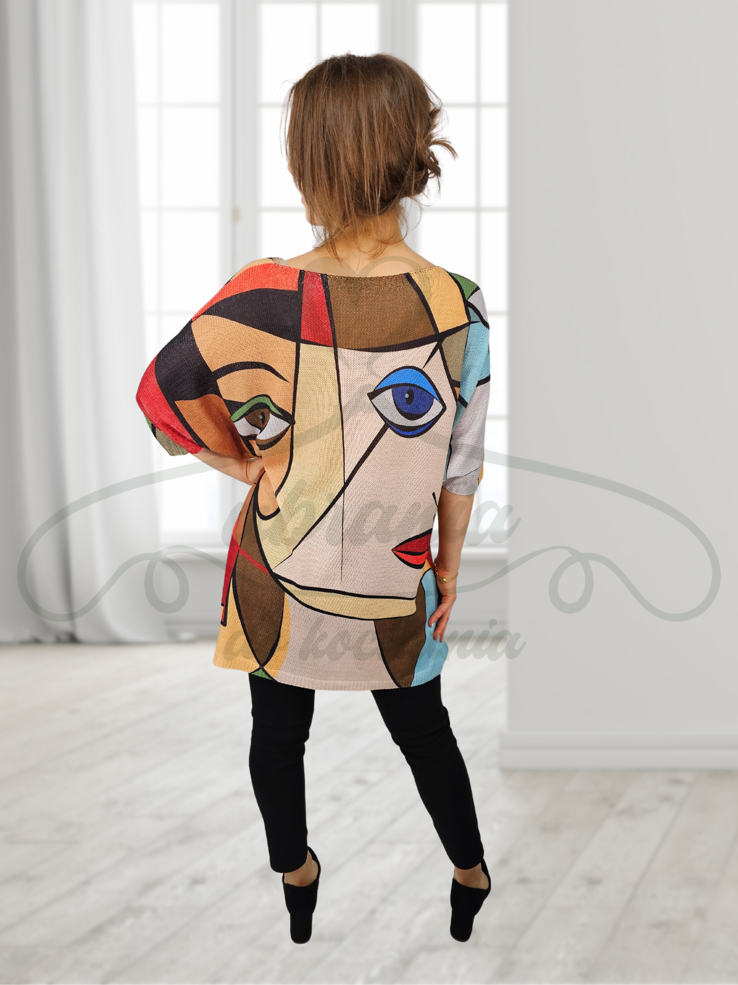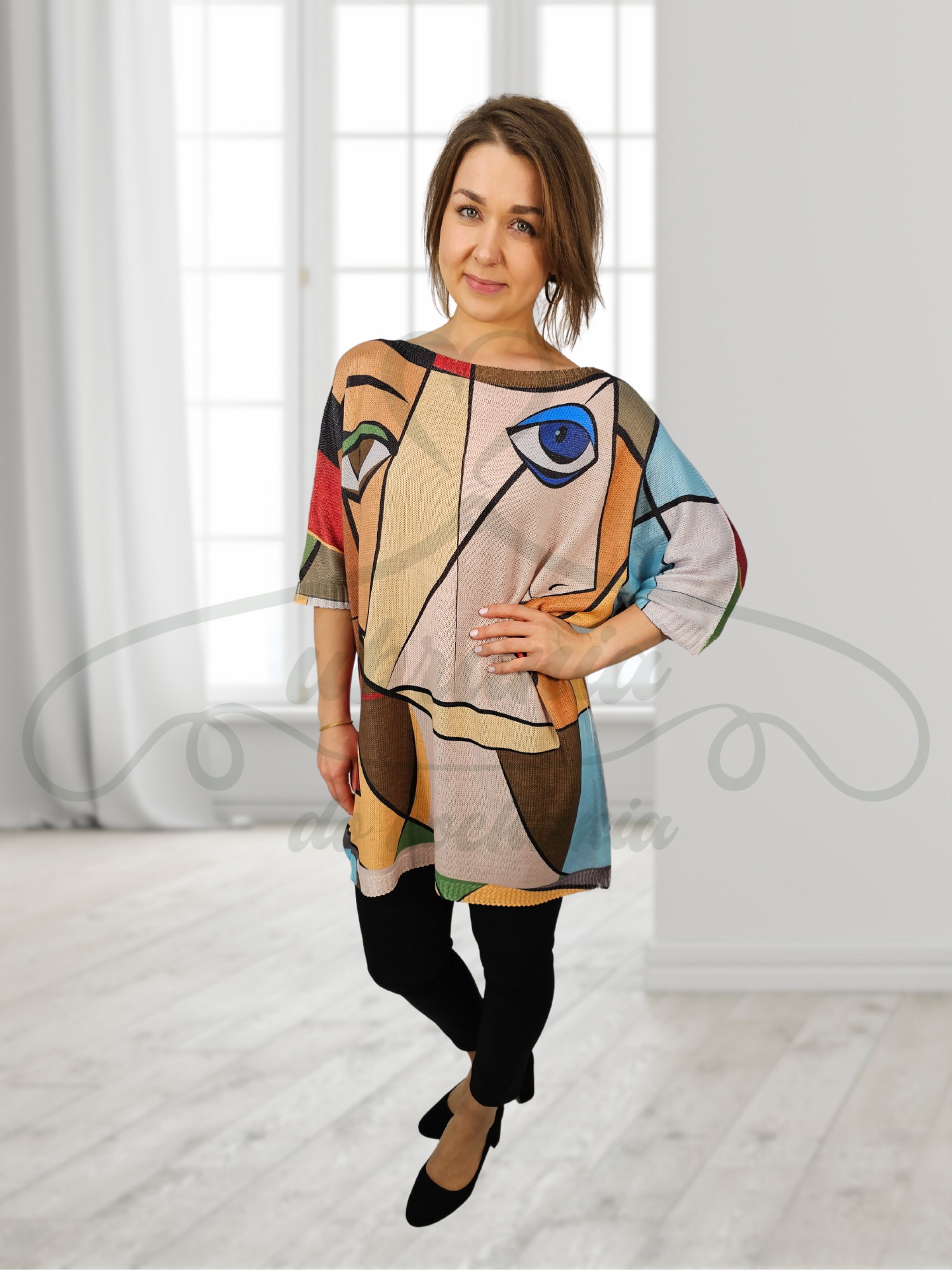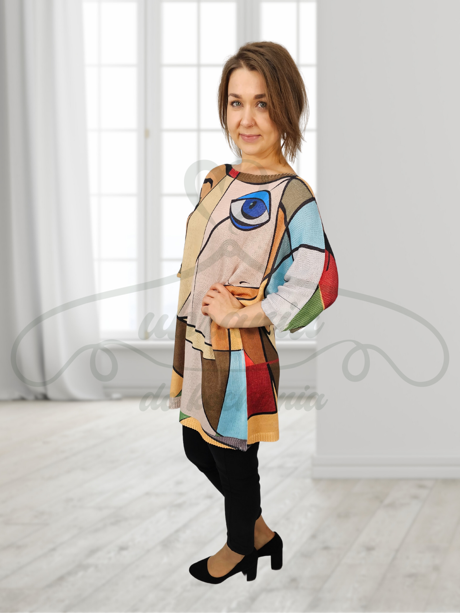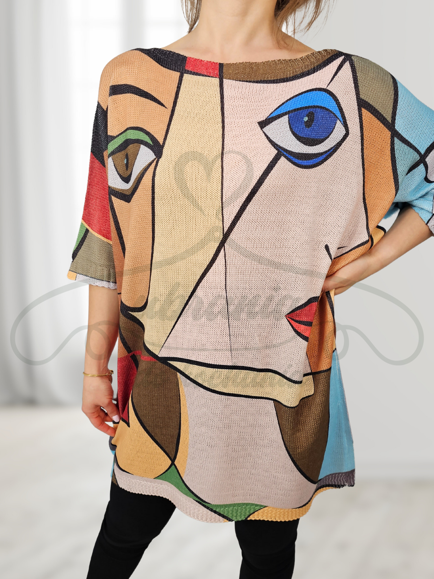 Wygodna i praktyczna tunika o luźnym fasonie to dobry wybór do codziennych jeansów lub legginsów. Ma okrągły, lekko łódkowaty dekolt oraz rękawy długości 7/8 oraz fason tzw. kimono. Abstrakcyjne wzory prezentują się niczym dzieło artysty malarza. Intensywne kolory dobrze współgrają z różnymi typami urody. Fason wkładany przez głowę.