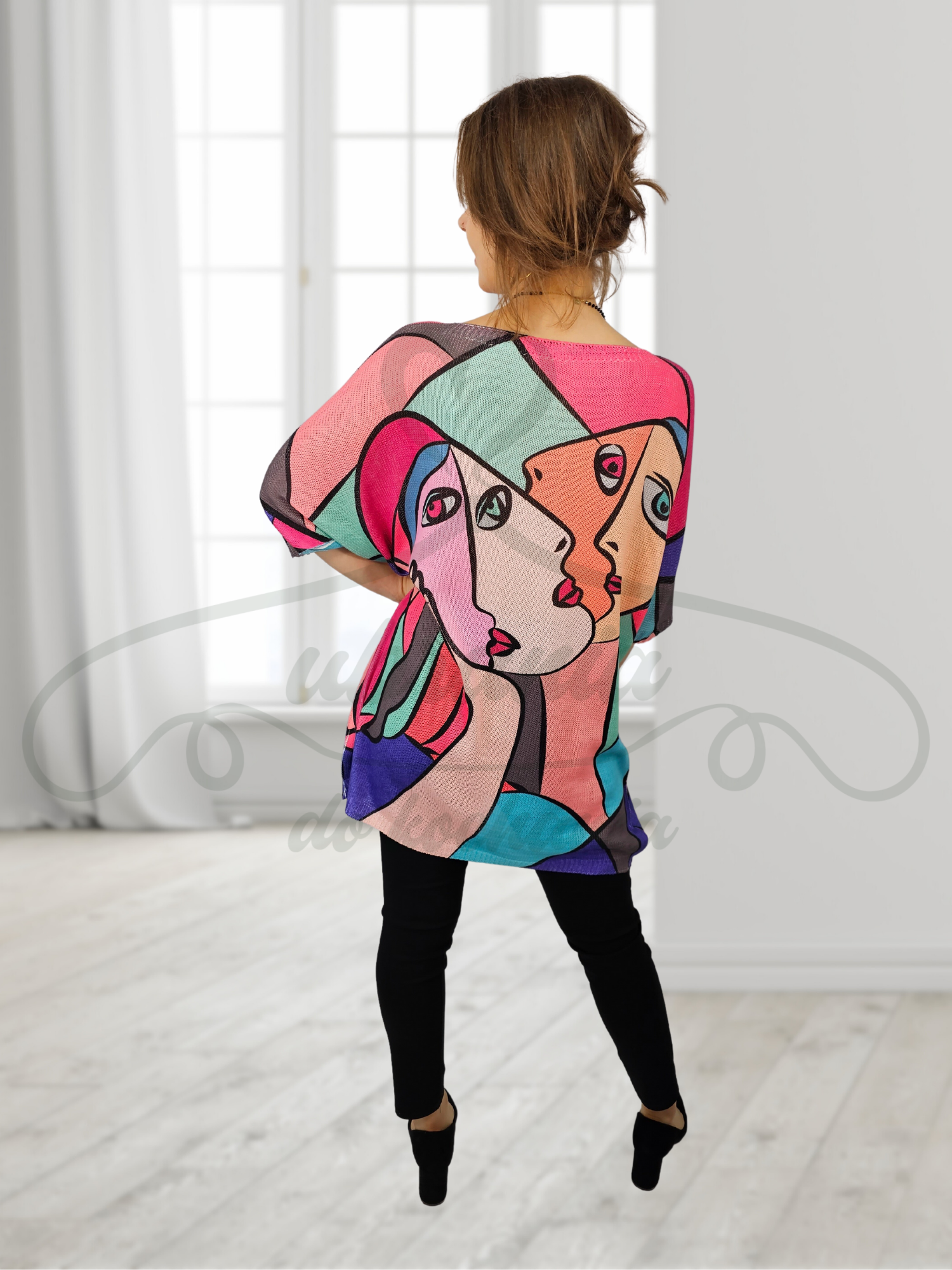 Wygodna i praktyczna tunika o luźnym fasonie to dobry wybór do codziennych jeansów lub legginsów. Ma okrągły, lekko łódkowaty dekolt oraz rękawy długości 7/8 oraz fason tzw. kimono. Abstrakcyjne wzory prezentują się niczym dzieło artysty malarza. Intensywne kolory dobrze współgrają z różnymi typami urody. Fason wkładany przez głowę.