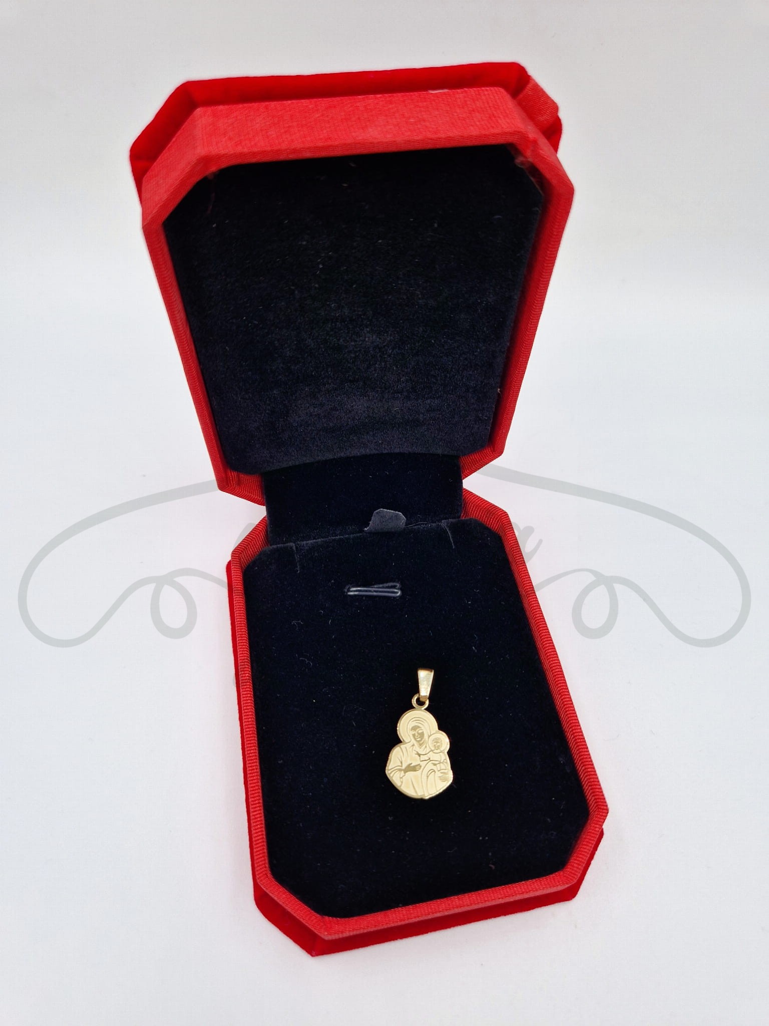 Zawieszka w kolorze złotym z wizerunkiem Matki Boskiej. Wykonana ze stali szlachetnej. Idealnie pasująca do wszystkich złotych łańcuszków. Prosty, elegancki wzór, który od razu wpada w oko. Uniwersalny styl, pasuje do każdego rodzaju stroju.