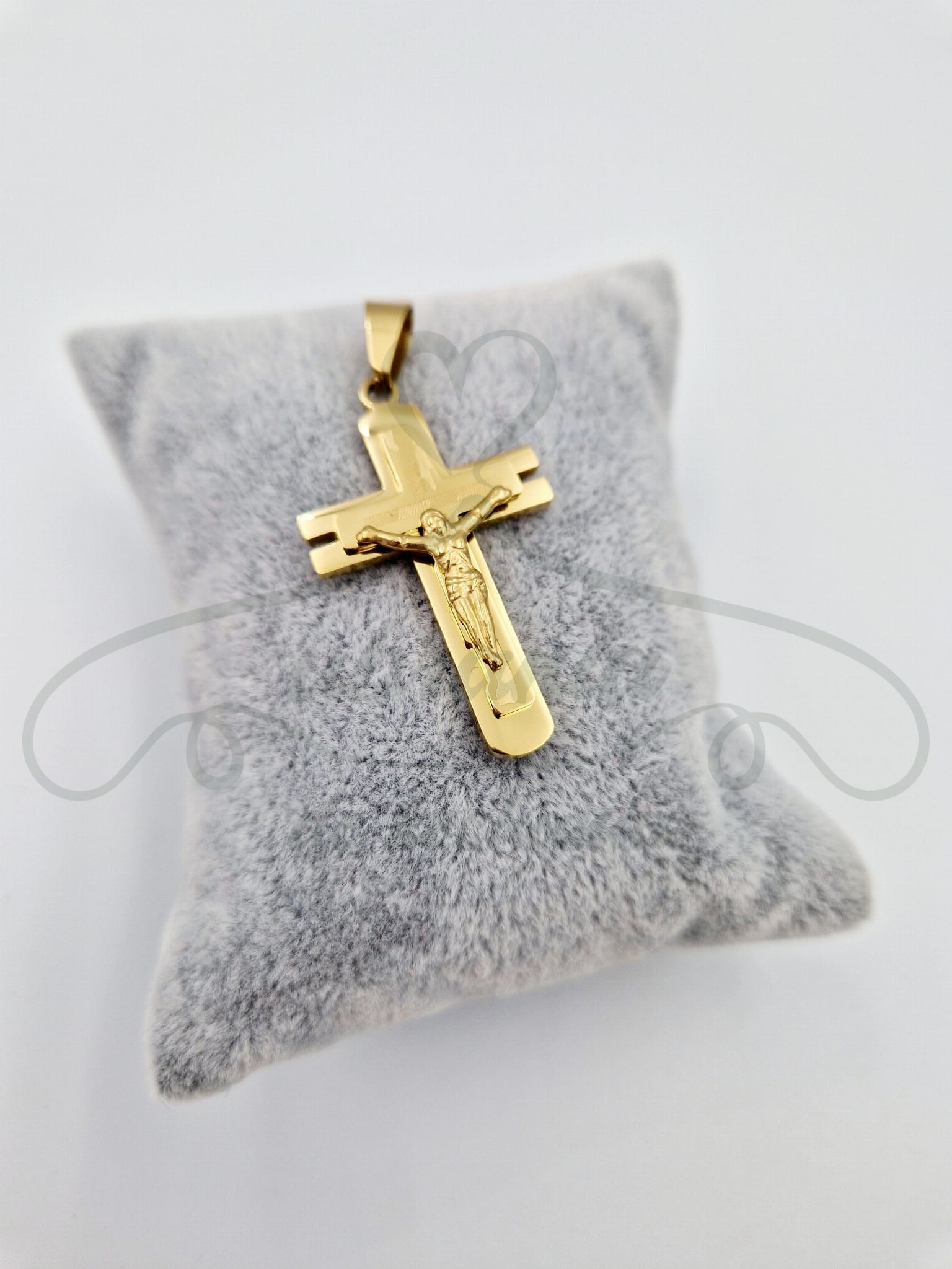 Zawieszka krzyżyk z Jezusem w kolorze złotym wykonana ze stali szlachetnej. Idealnie pasująca do wszystkich złotych łańcuszków. Nadaje się również do grubych łańcuszków, ze względu na duże oczko zawieszki.