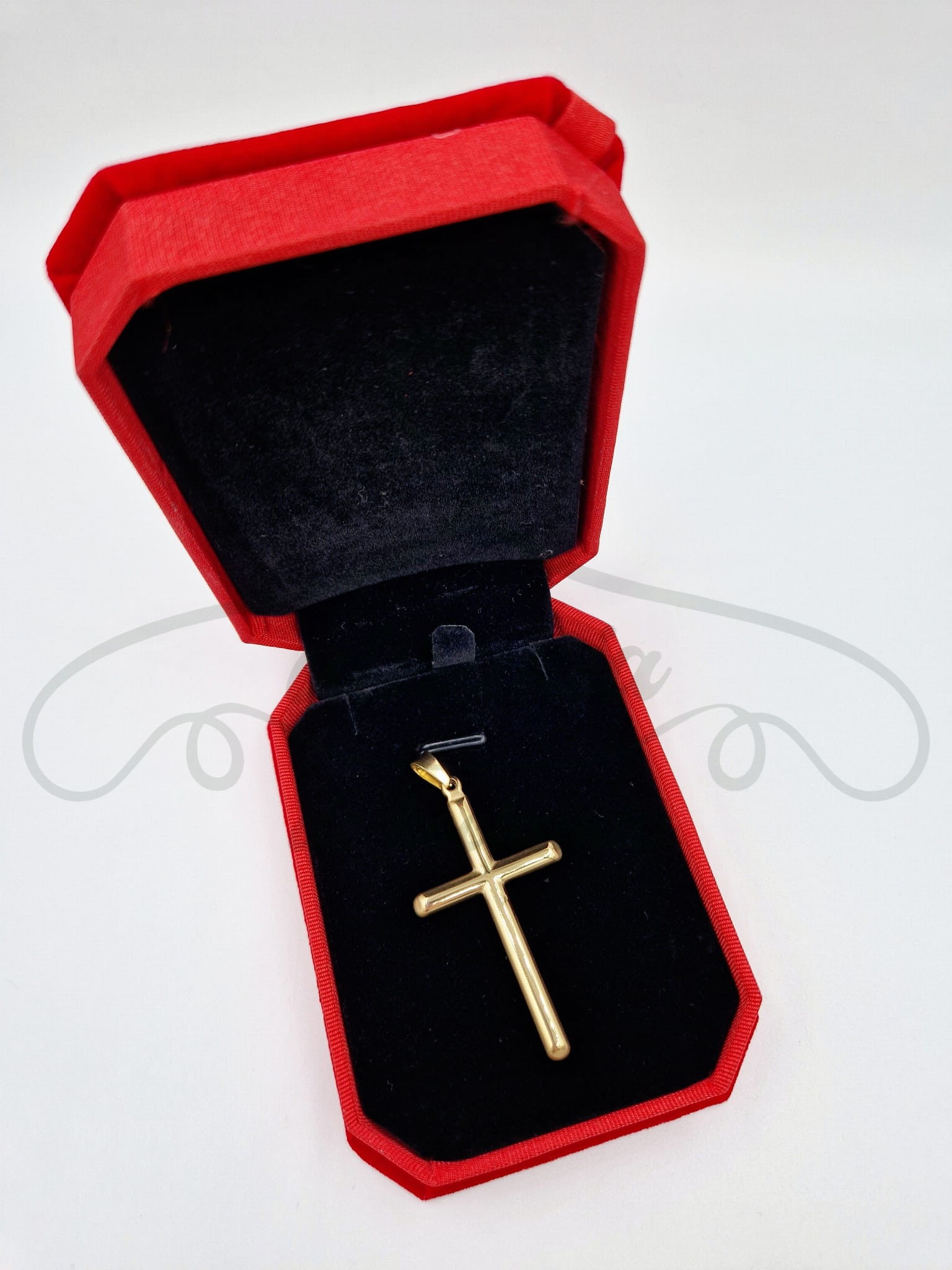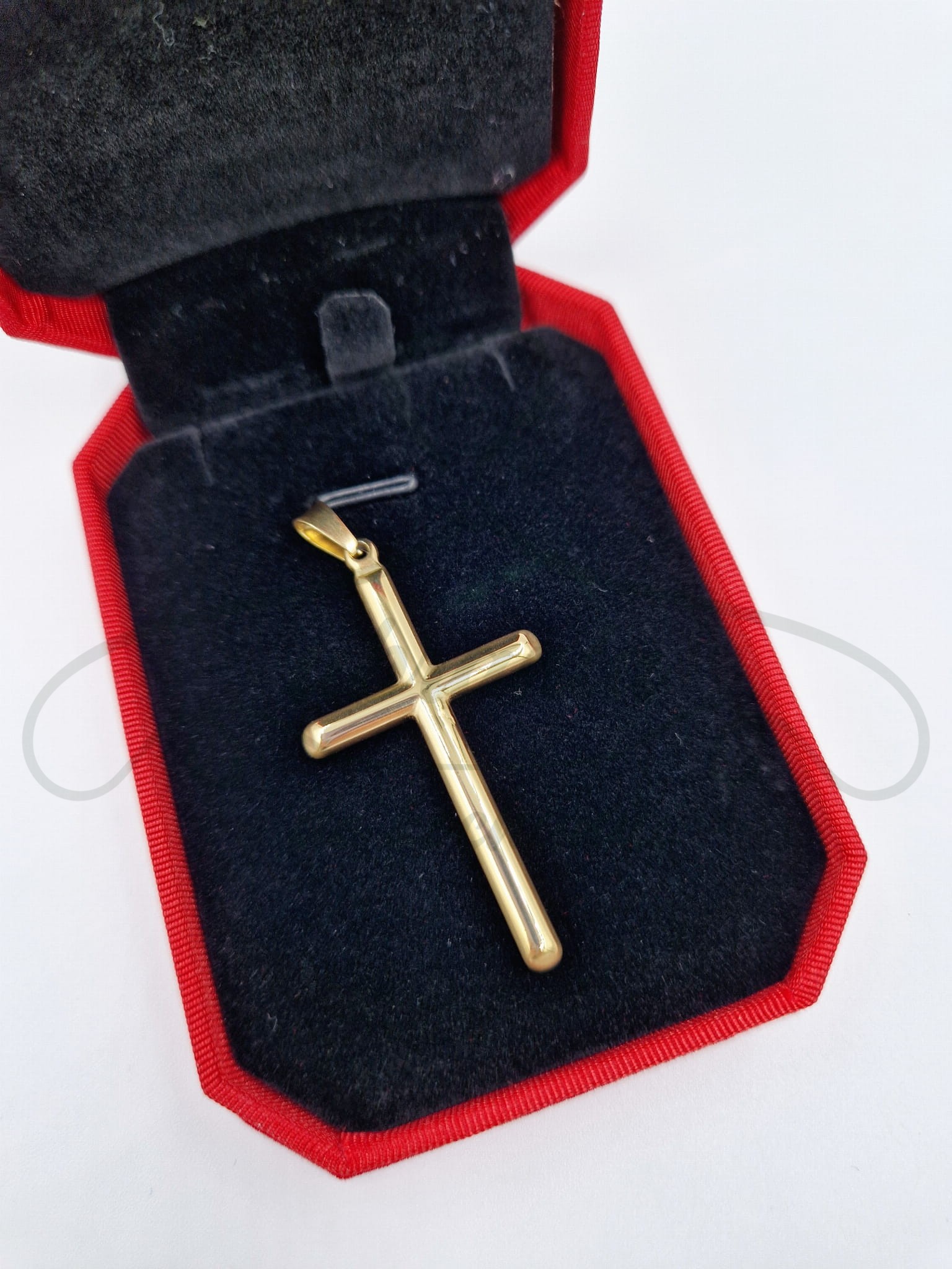 Zawieszka krzyż w kolorze złotym, wykonany ze stali szlachetnej. Idealnie pasujący do wszystkich złotych łańcuszków zarówno męskich jak i damskich