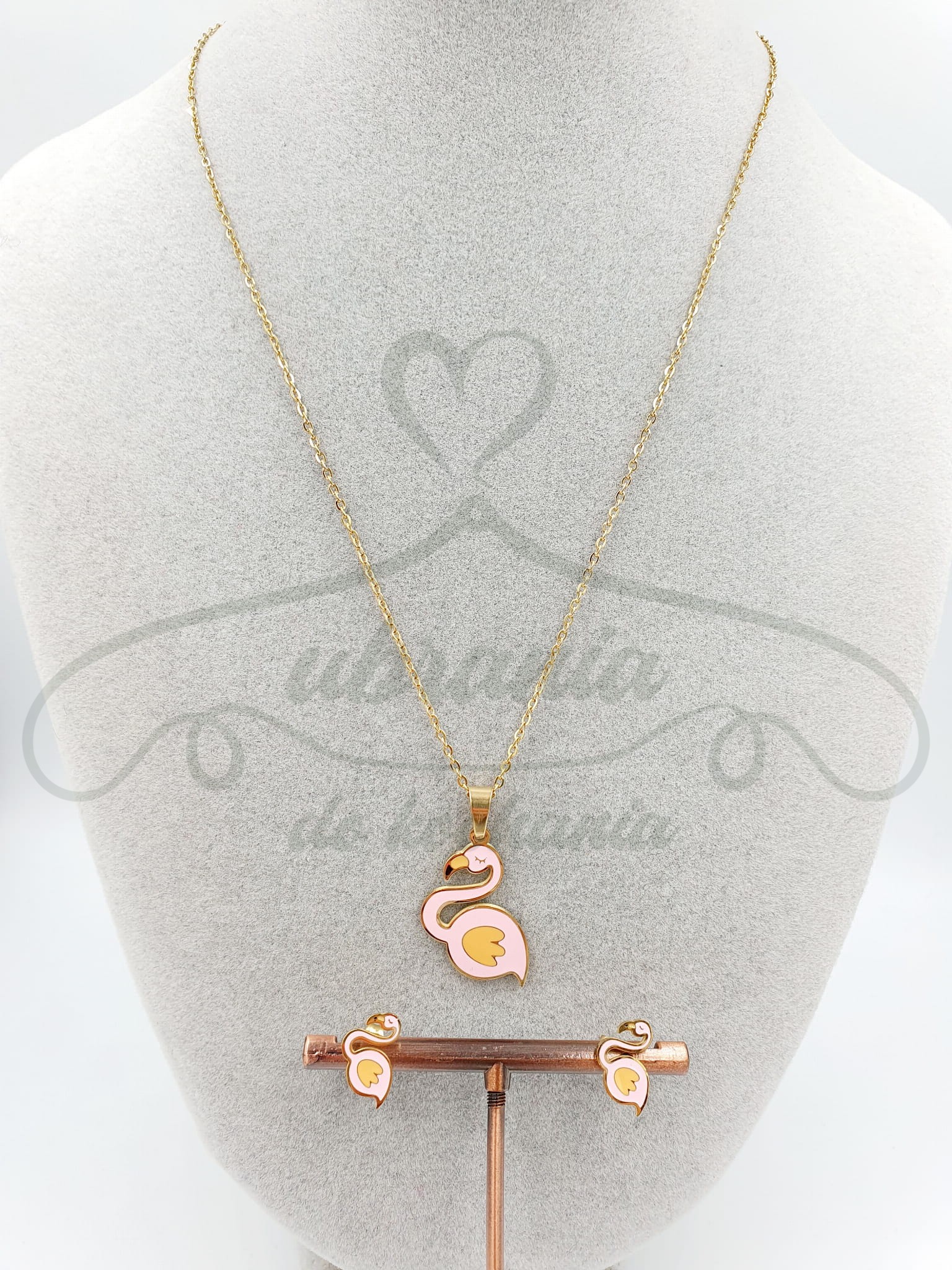 Piękny zestaw w sam raz na lato- naszyjnik oraz kolczyki w kolorze złotym z flamingiem różowym. Wykonane ze stali chirurgicznej 316 L.